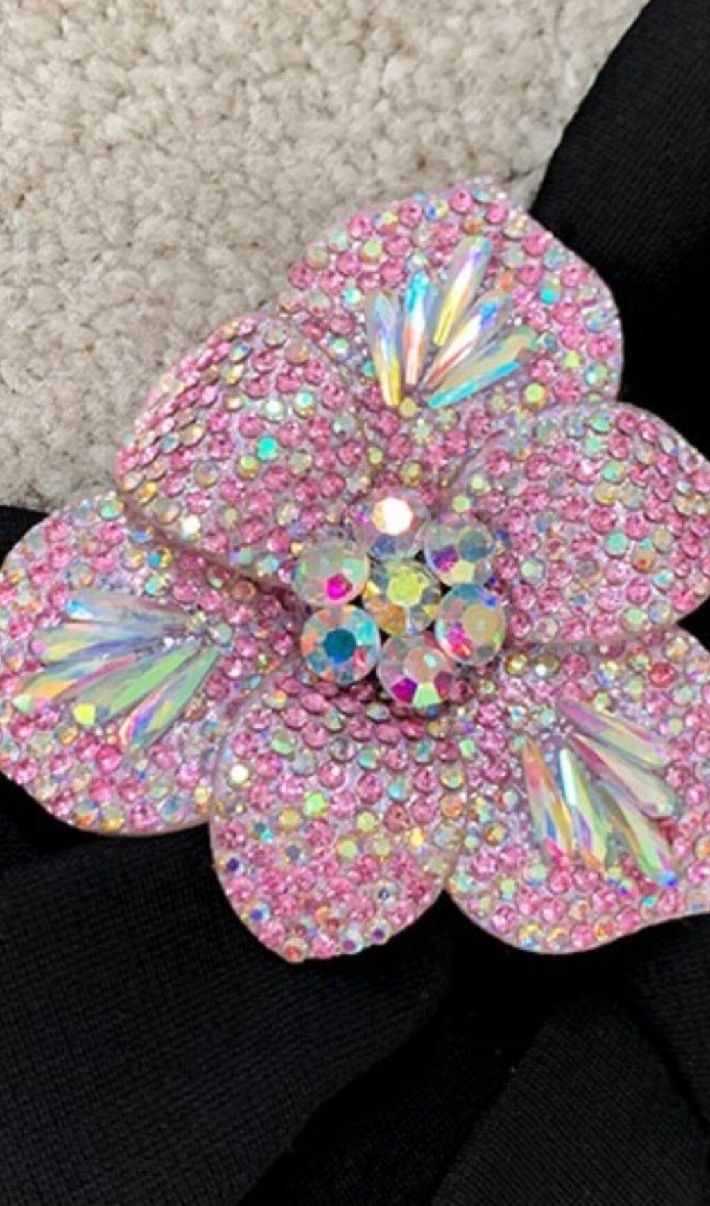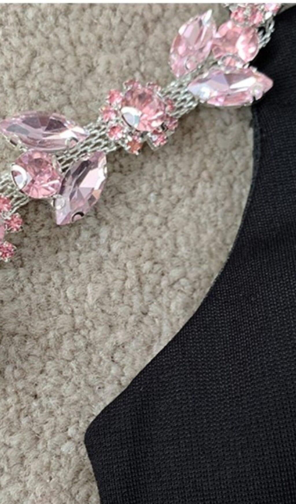 We believe that black doesn't have to be boring. That's why we added a touch of pink to this dress. The shoulder straps are adorned with pink diamonds, creating a playful and eye-catching detail. Additionally, a cute pink flower is delicately decorated on the chest, adding a lively and girlish touch to the overall look.
