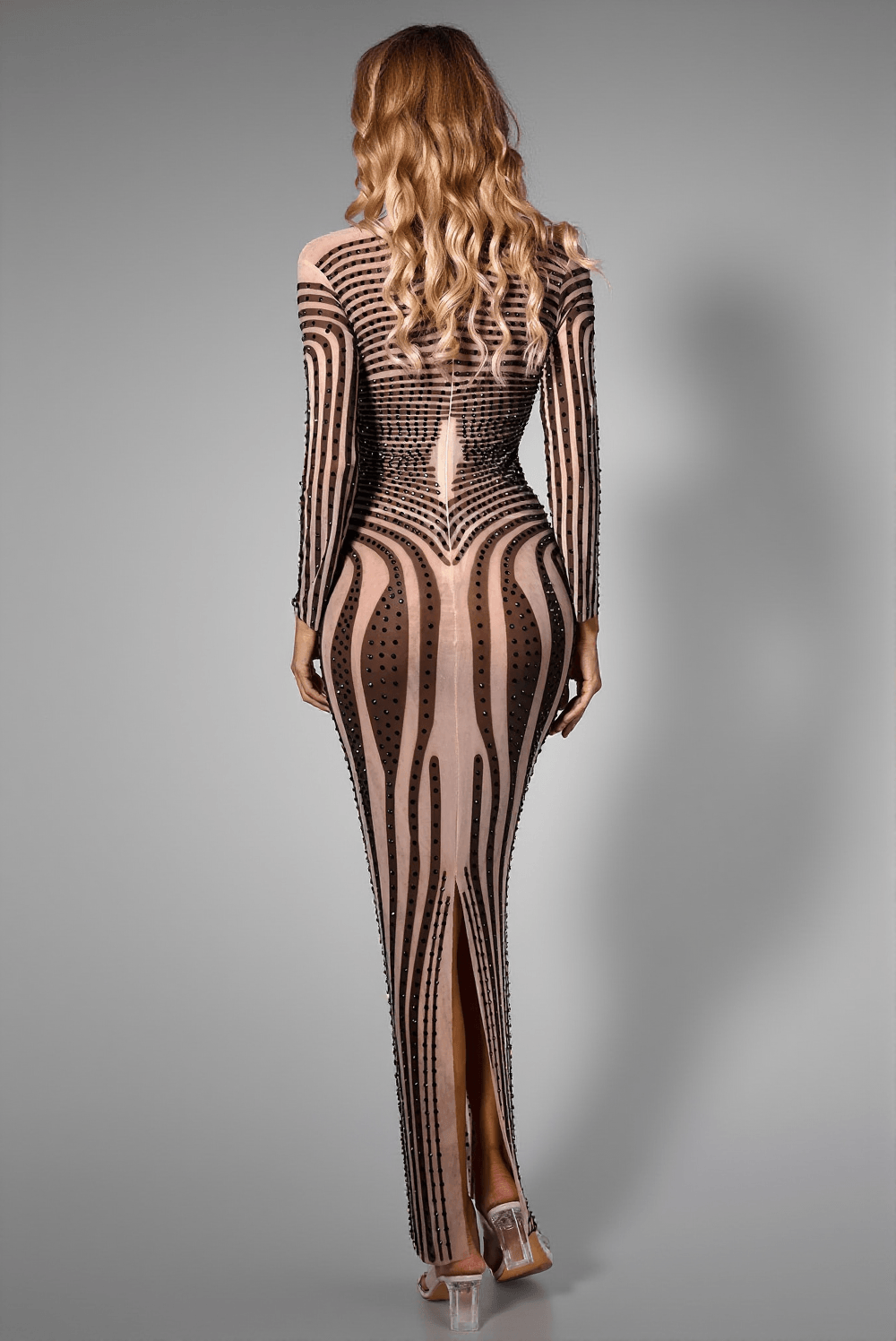 Dive into a world of elegance and sophistication with the Brittyn Diamond Stripe Mesh Dress. This stunning black ensemble, featuring sheer mesh fabric adorned with dazzling diamond patterns, is designed to make you shine at any evening event.