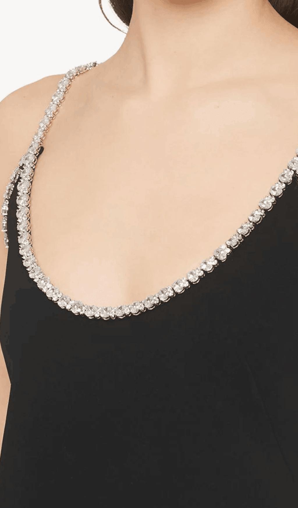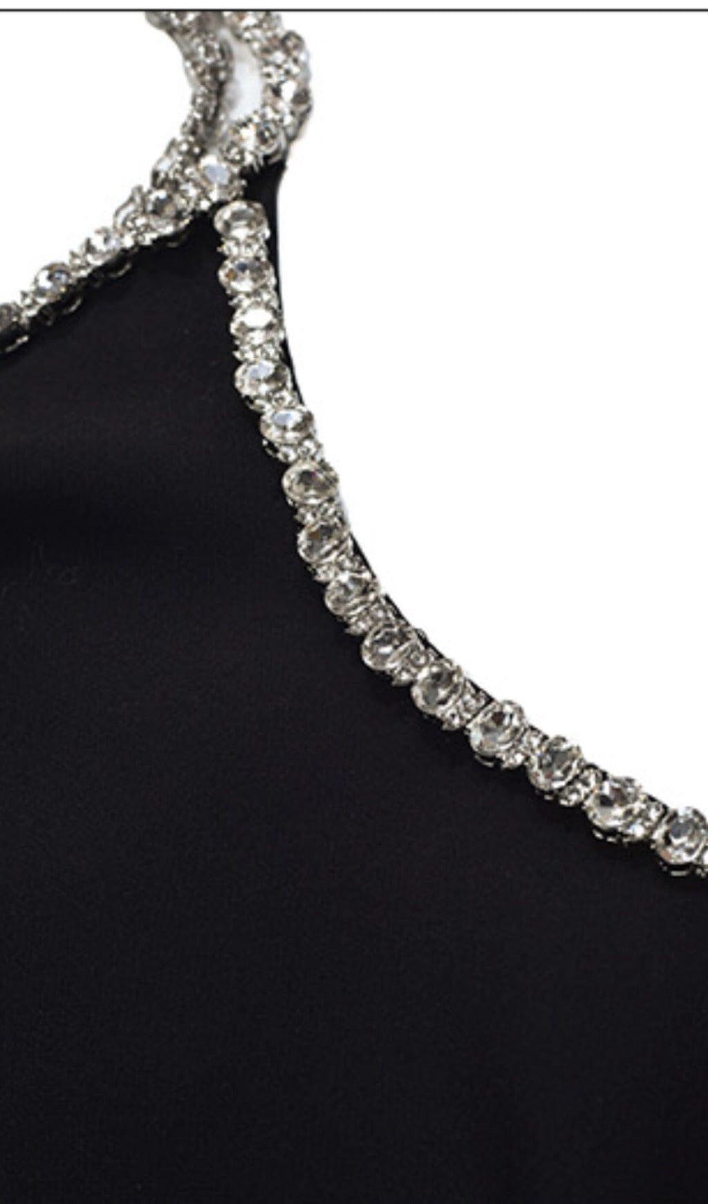 DIAMOND-TRIMMED SUSPENDER MINI DRESS IN BLACK