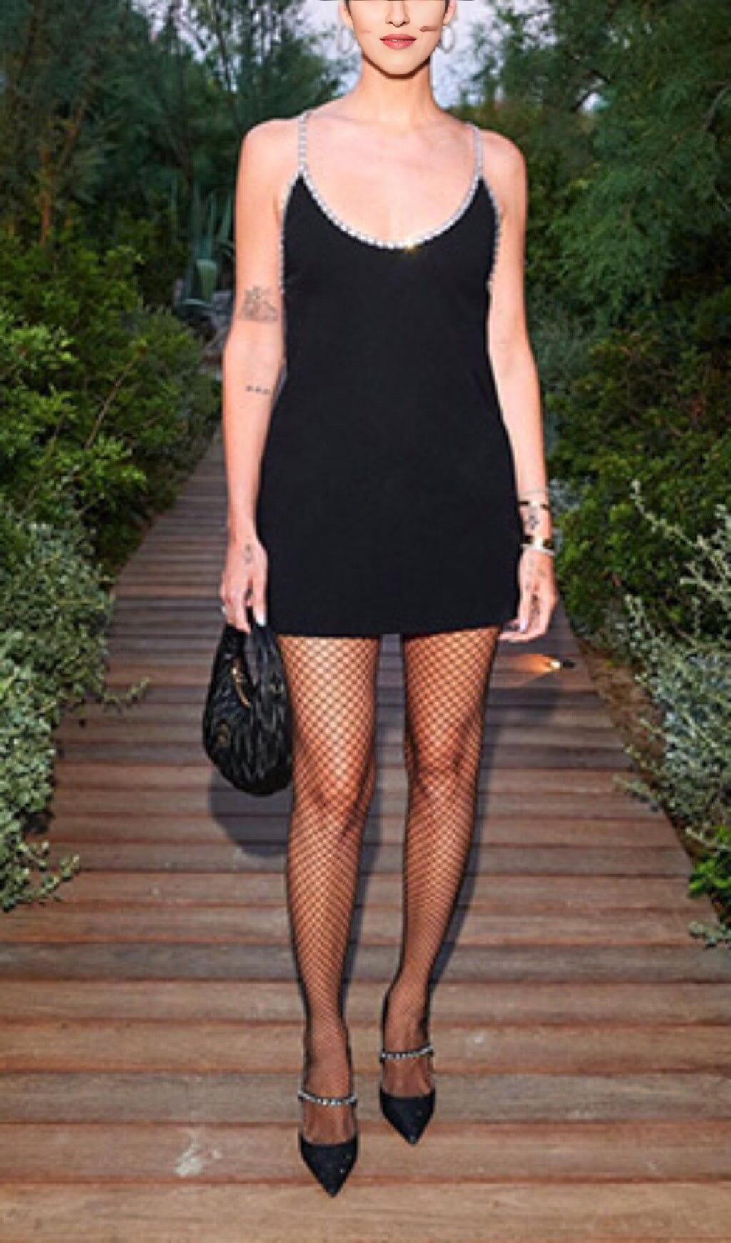 Introducing our Diamond-Trimmed Suspender Mini Dress, the perfect combination of elegance and style. This dress is designed to make you look petite and exquisite, while adding a touch of glamour to your outfit.