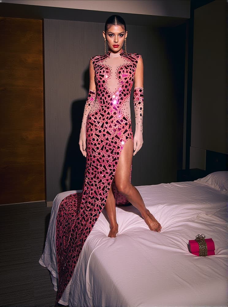 Dolor Sleeves Embellished Maxi Dress With Gloves In Pink