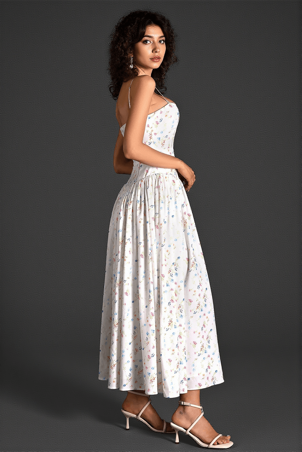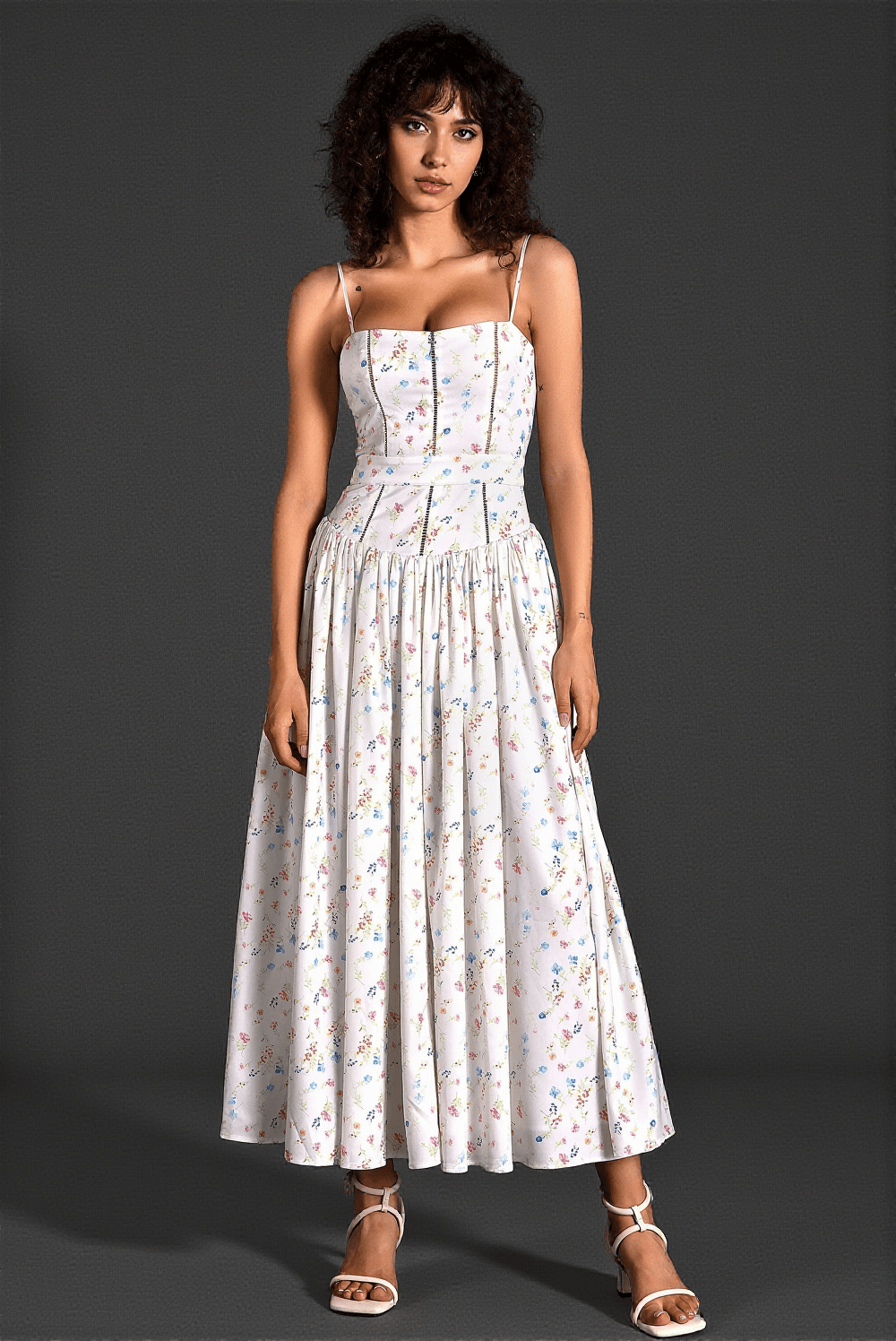 The model is wearing a size medium in our Dotty Spaghetti Woven Print Dress, showcasing the perfect blend of comfort and style. This dress is designed to fit true to size with a comfortable stretch for all body types.