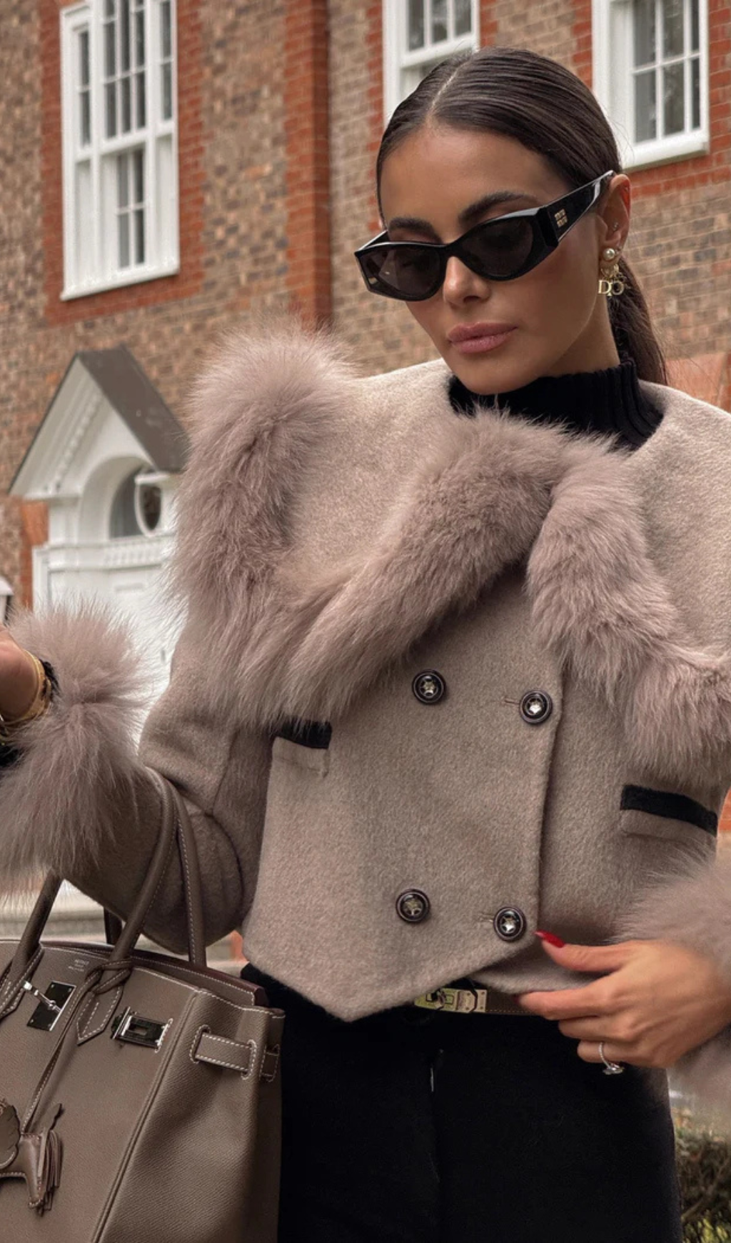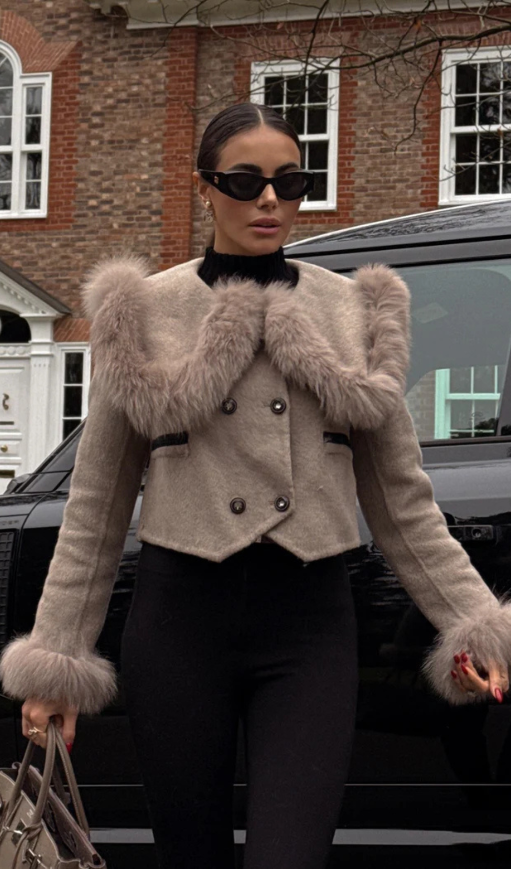 DOUBLE BREASTED CROPPED JACKET WITH FUR COLLAR EMBELLISHMENT - GRAY