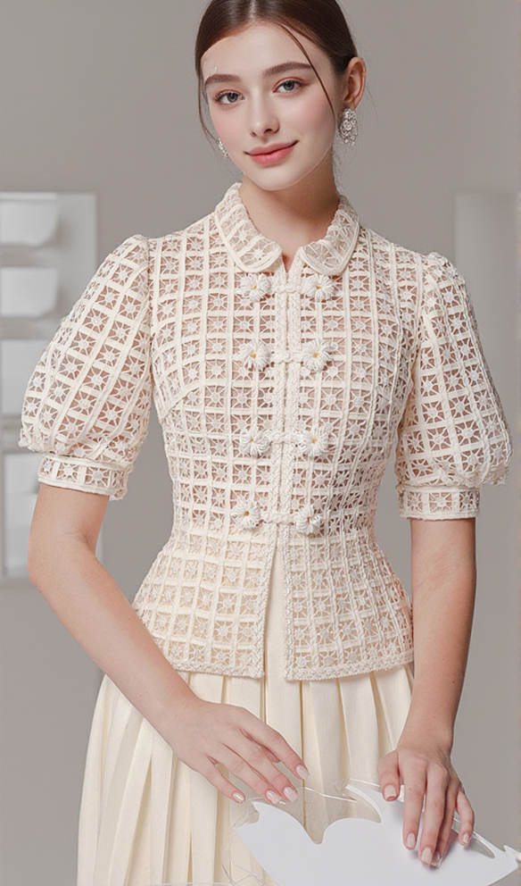 double breasted lantern sleeve lace top pleated skirt set in apricot