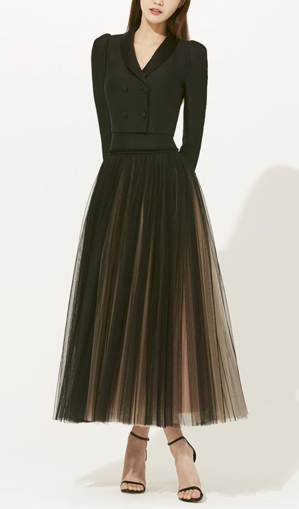 DOUBLE-BREASTED LONG-SLEEVED BLAZER AND WAISTED MESH DRESS