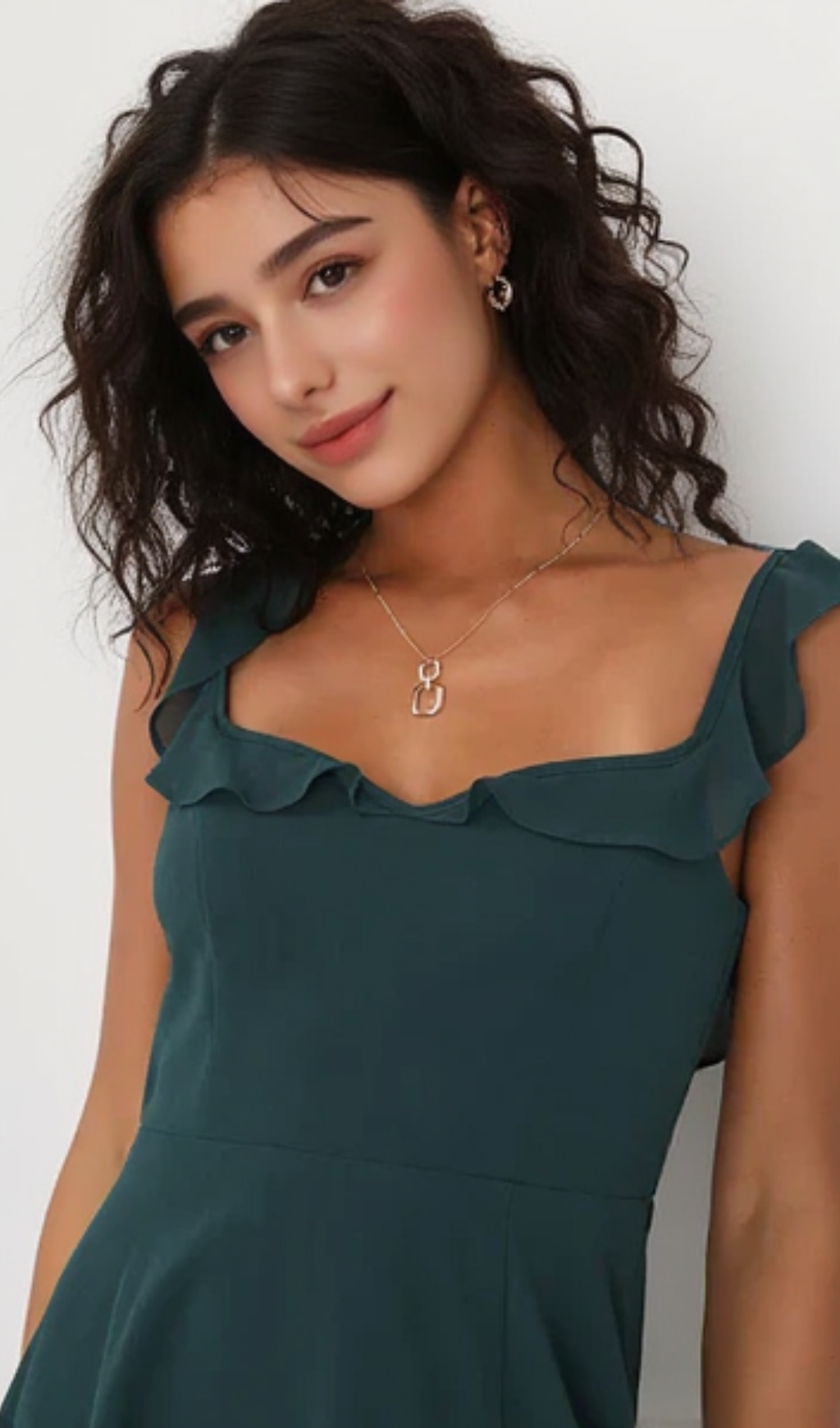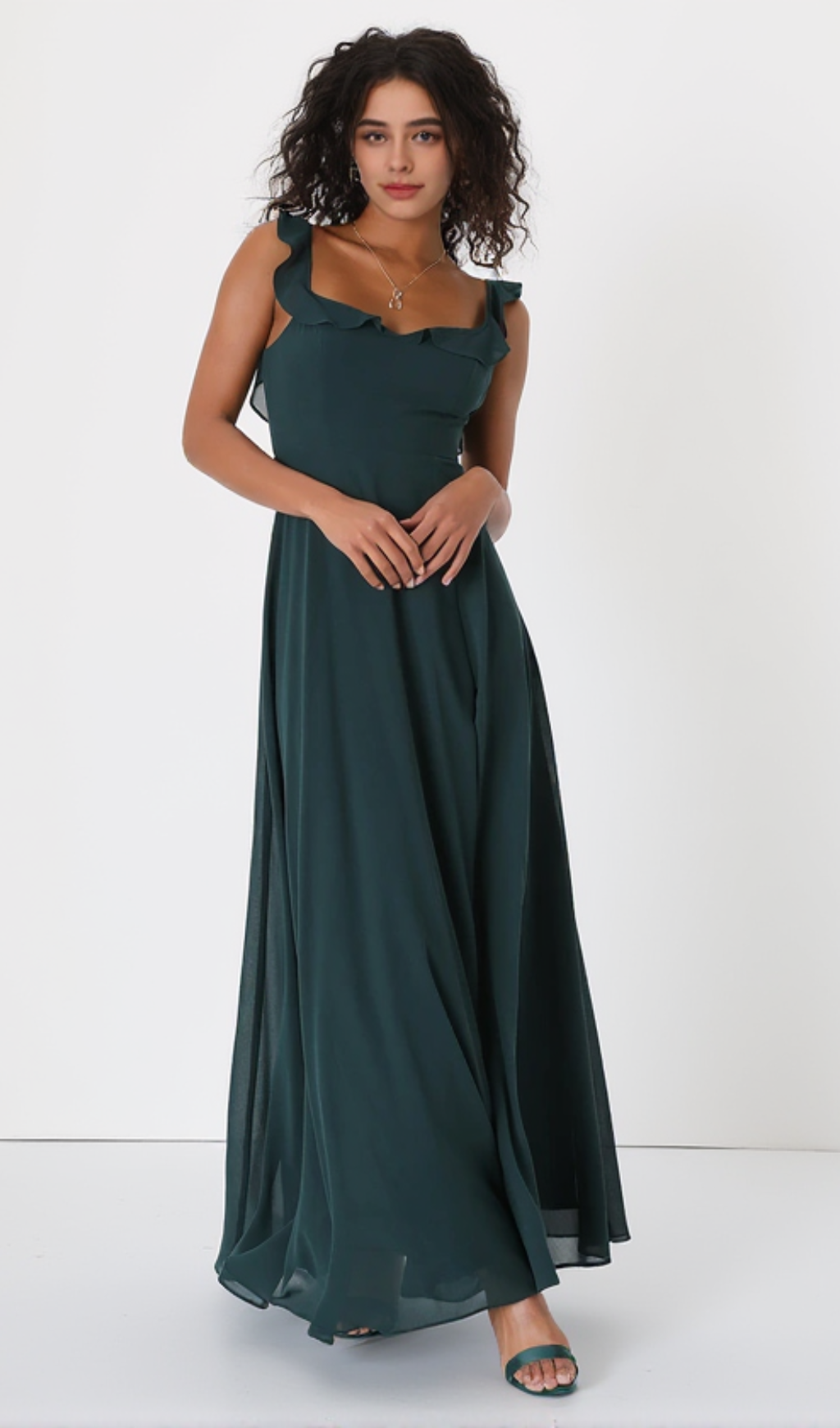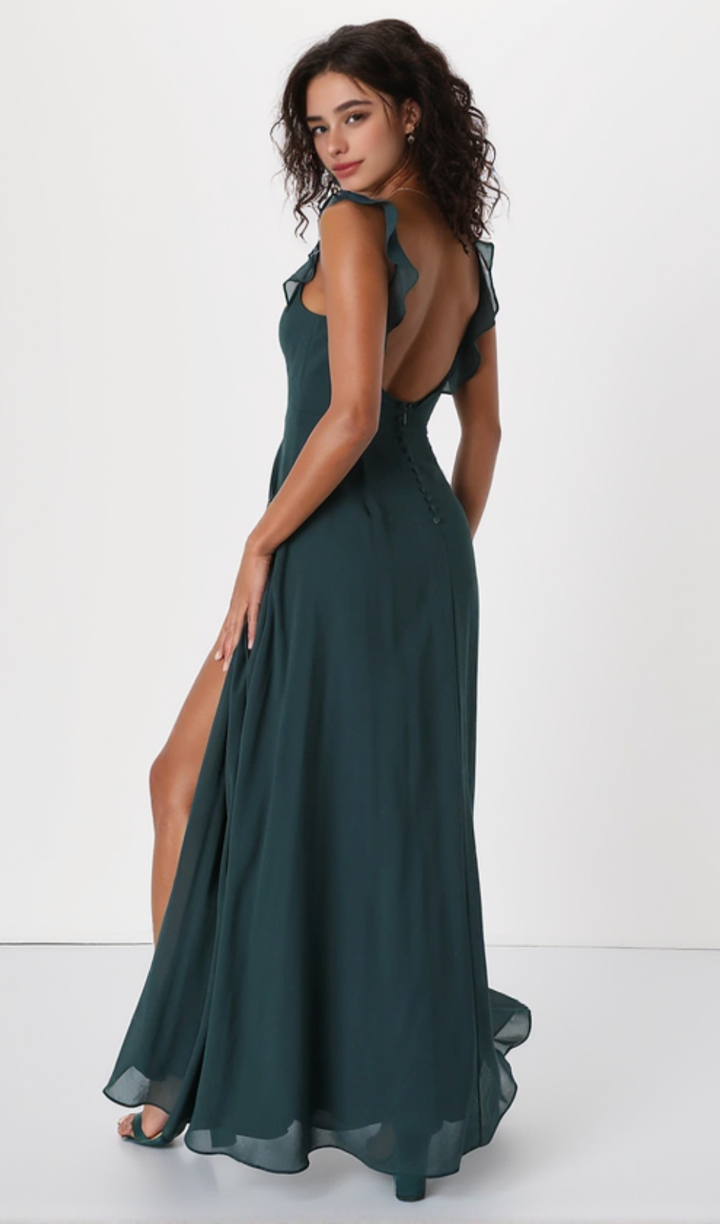 Twirl through the night meeting new admirers left and right in the Dreamy Admiration Emerald Green Ruffled Maxi Dress! Flowy woven chiffon creates this stunning dress that falls from ruffled straps into a sweetheart neckline and a princess-seamed bodice. High, fitted waist sits atop an elegant A-line maxi skirt with a sultry, thigh-high side slit. Turn around to reveal a sultry V-back design and a row of decorative covered buttons. Hidden back zipper/clasp.