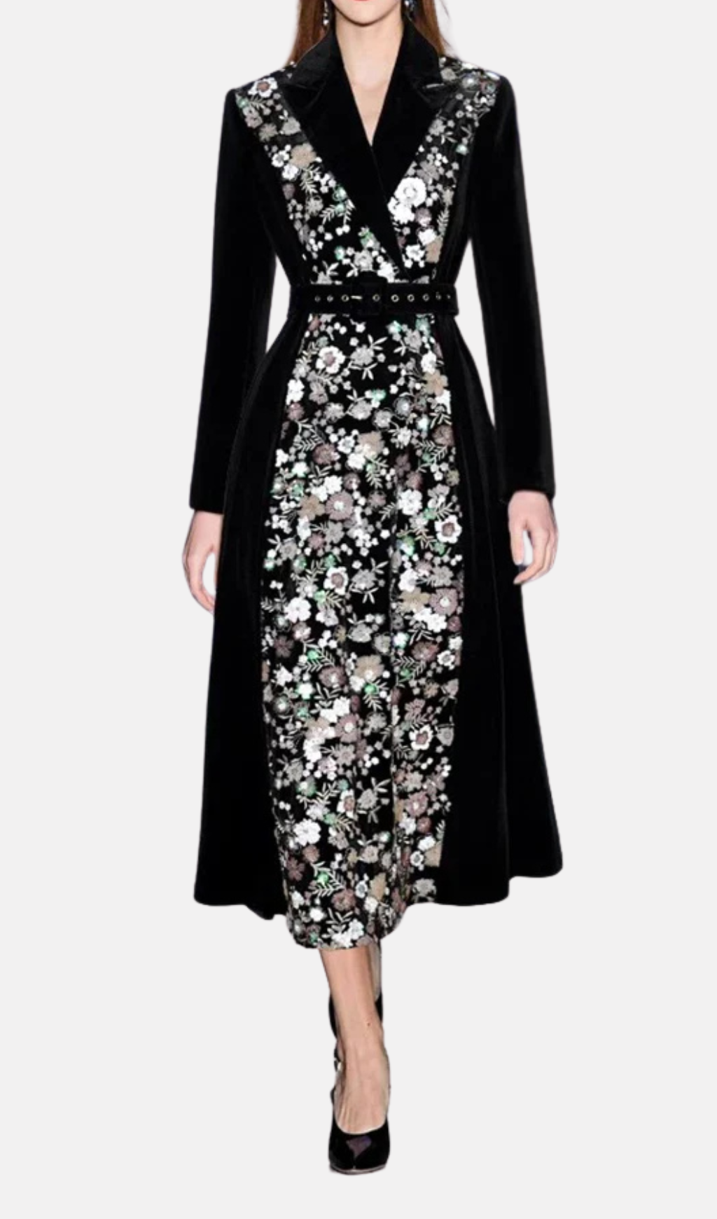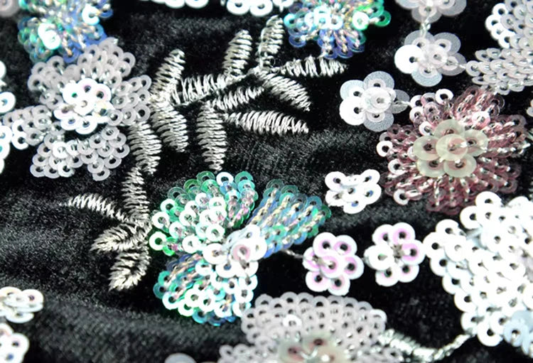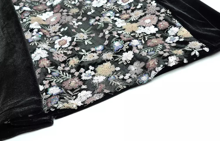This black velvet midi dress is adorned with stunning sequin embroidery, making it the perfect choice for any special occasion or event. The luxurious fabric and intricate detailing will make you feel glamorous and elegant. Make a statement and turn heads with this one-of-a-kind dress!