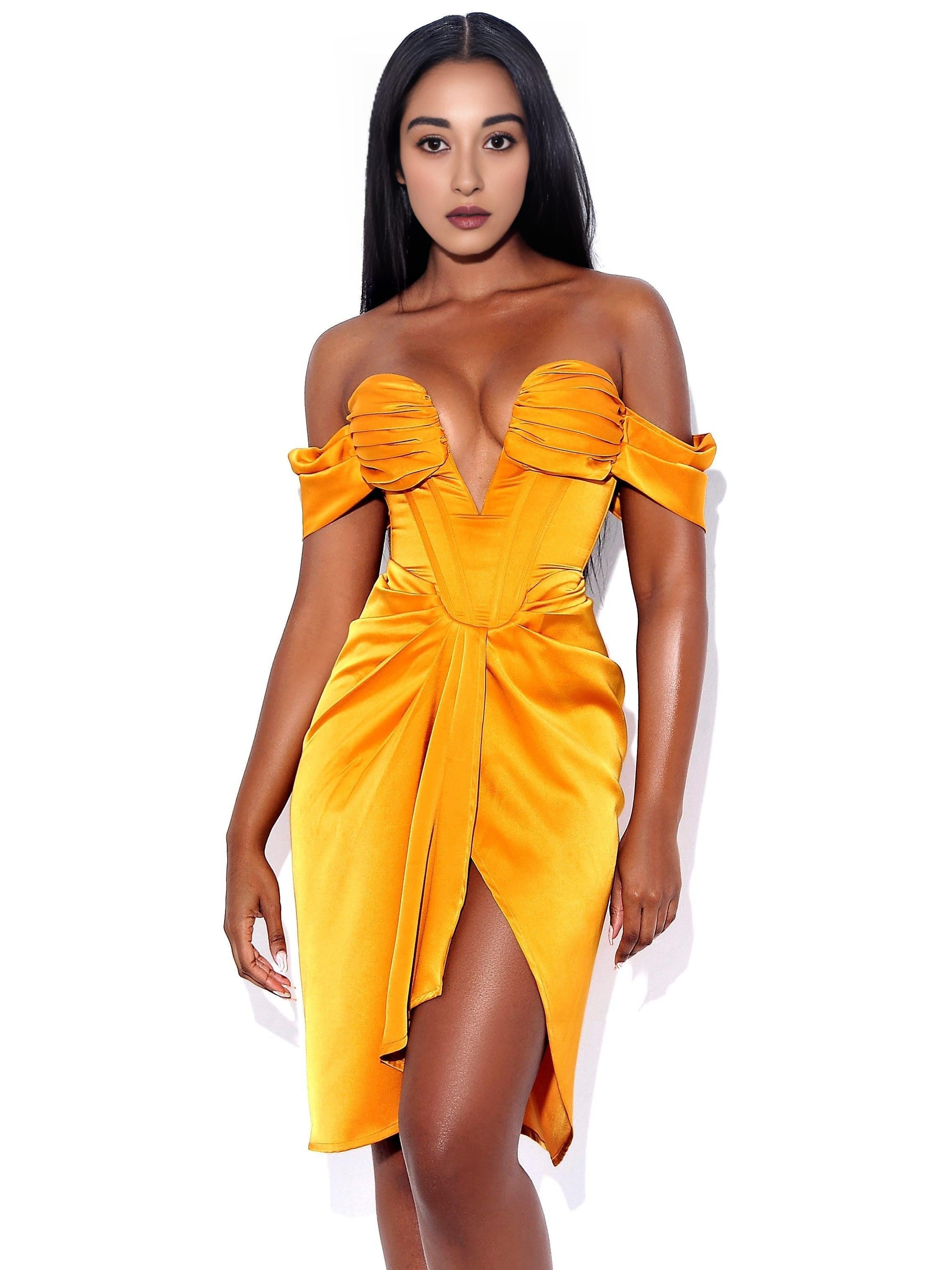 DREYA GOLD OFF SHOULDER SATIN CORSET DRESS