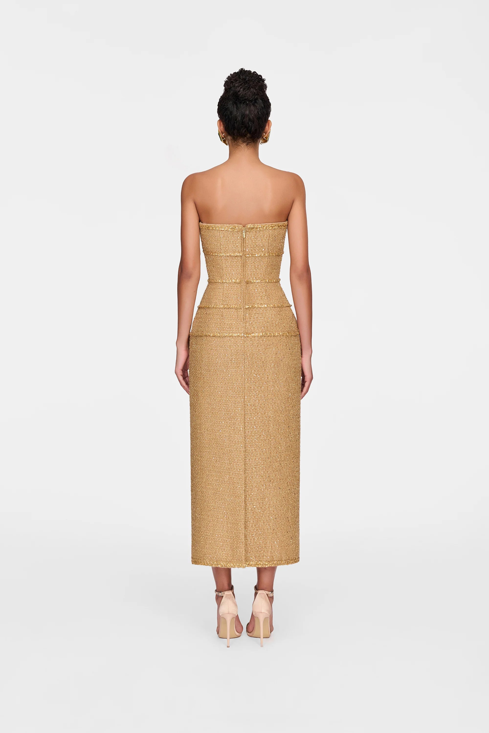 Indulge in luxury with our Elborno Gold Embellished Strapless Midi Dress. The intricate gold embellishments adorn the strapless bodice, creating a stunning focal point. The midi length adds a touch of sophistication while the strapless design showcases your décolletage. Elevate any occasion with this exquisite dress.