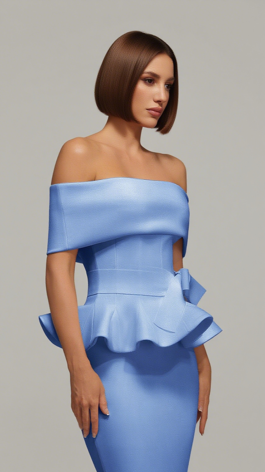 ELEANORE OFF THE SHOULDER RUFFLED EDGE BLUE MIDI DRESS