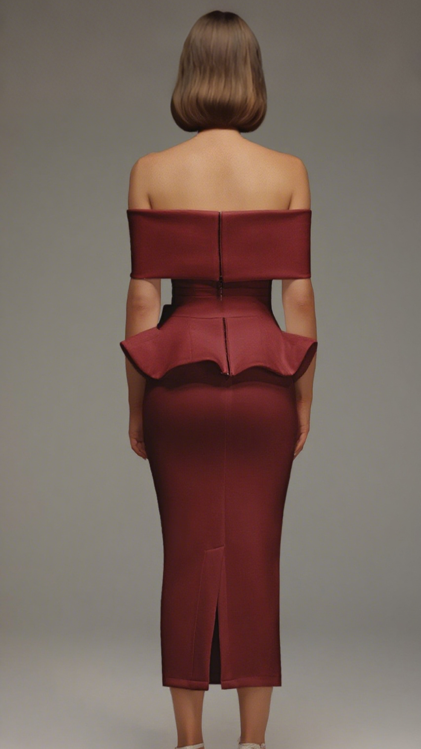 ELEANORE OFF THE SHOULDER RUFFLED EDGE RED MIDI DRESS