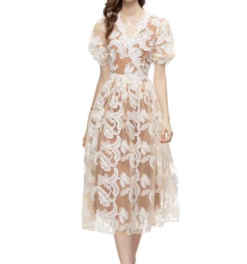 Skirt Body: The entire dress is covered with intricate and exquisite white lace patterns, which are delicate. It is a midi - length style, approximately reaching the knee area. It is both dignified and lively, and the skirt moves lightly and nimbly when walking.