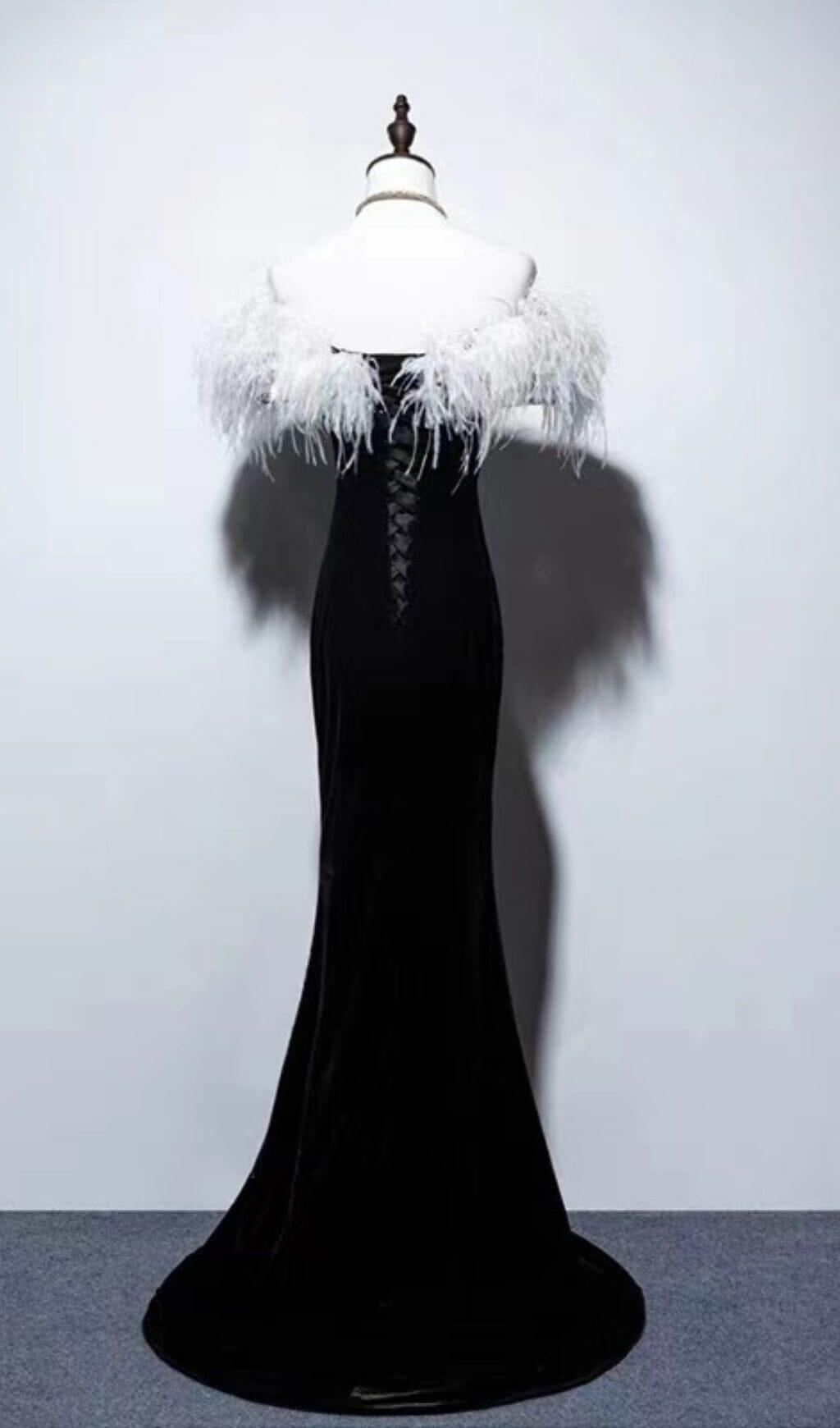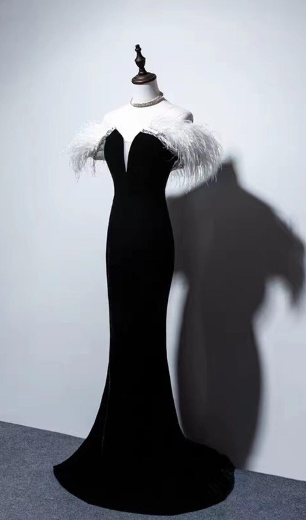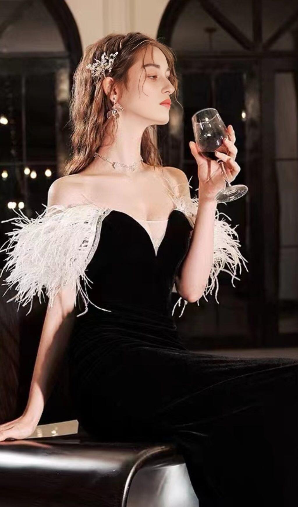 The narrow V-shaped collar at the neckline beautifully accentuates your elegant neck, giving it a slender appearance. The black fishtail long skirt adds an element of sophistication and allure, exuding a classic and delicate beauty. The feathers delicately placed along the chest and back create a captivating contrast against the black, adding a touch of playfulness and charm to the overall look.