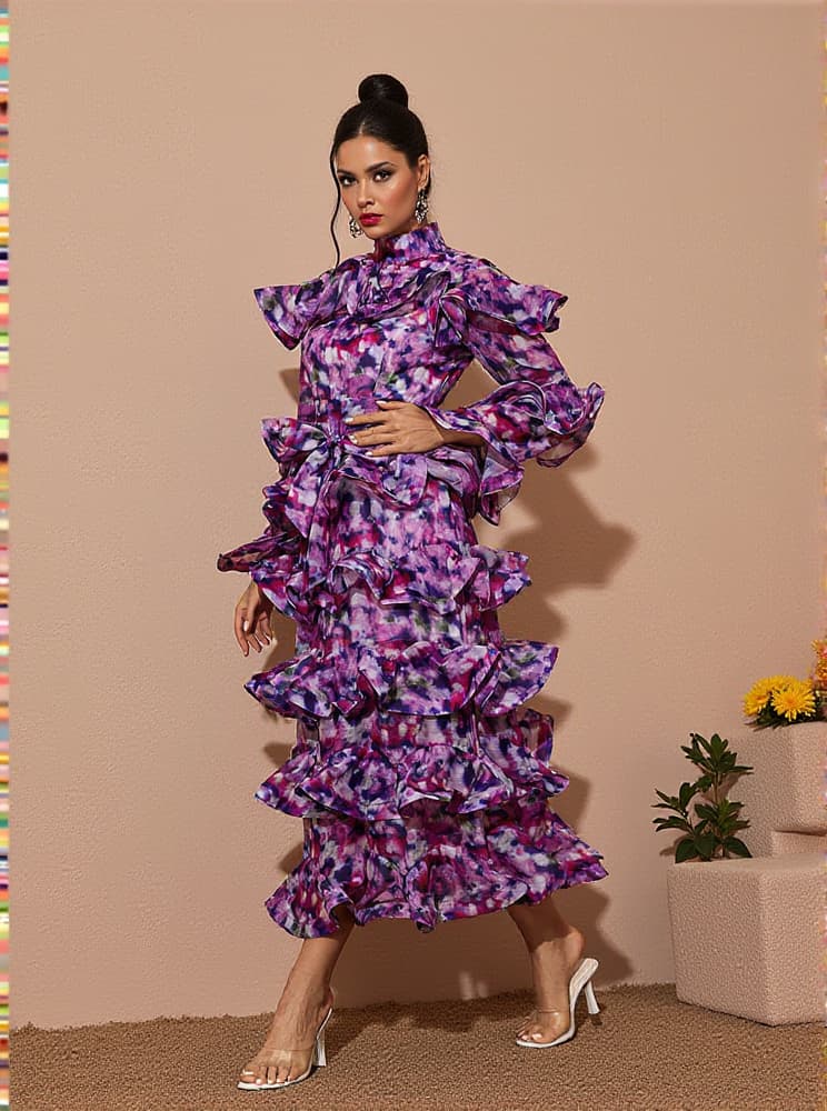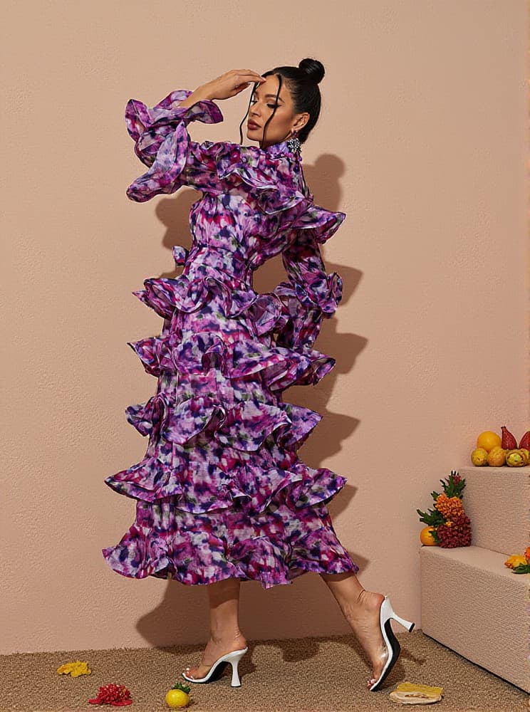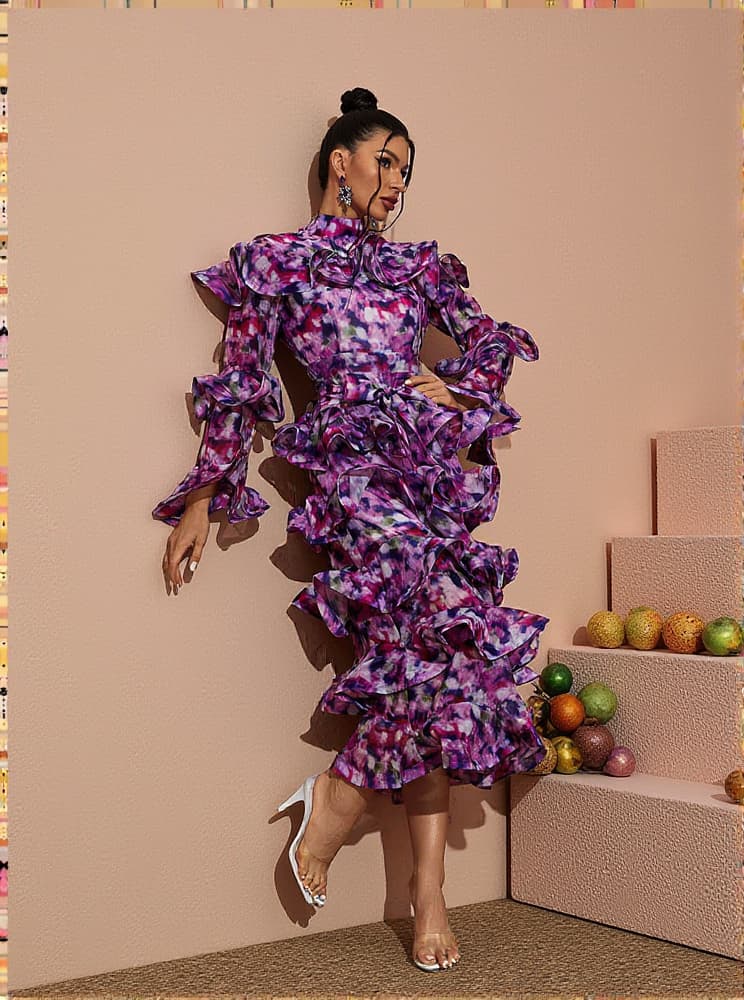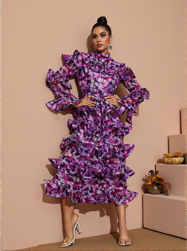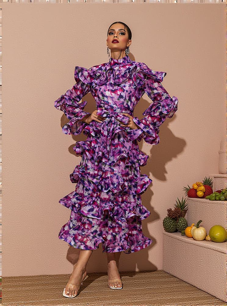 This Elena Printed Ruffle Midi Dress In Purple is the perfect statement piece for any season. Featuring a unique printed design in a bold purple shade, this midi dress offers an effortless way to stand out from the crowd. The lightweight fabric and ruffle detailing make it comfortable and stylish.