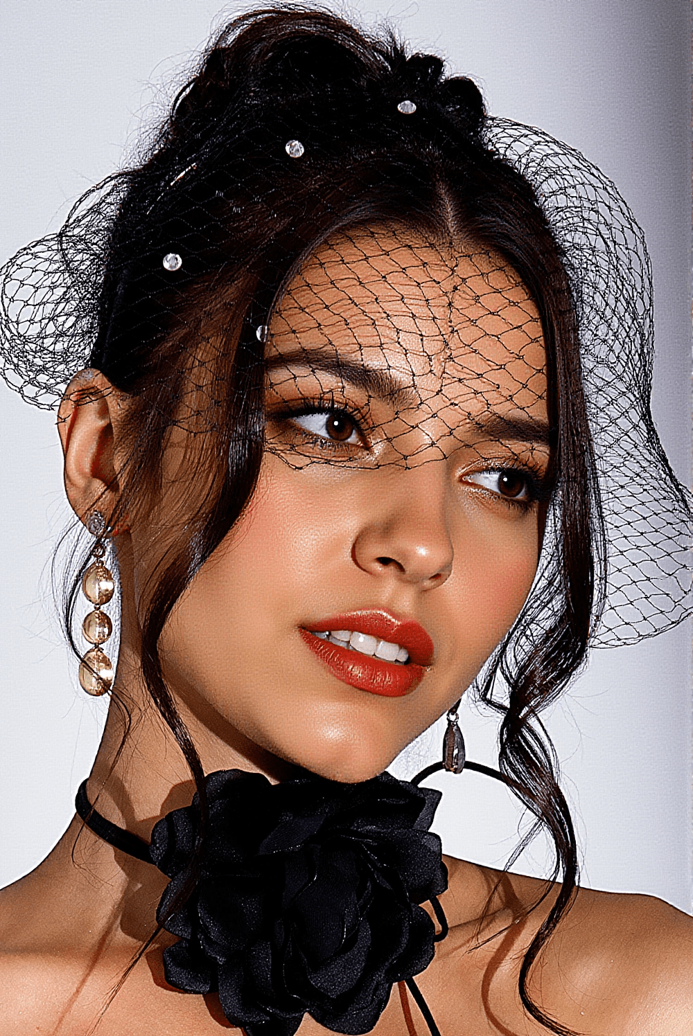 Model is wearing: Ellington Crystal Veil Hairband in a classic silver tone, perfectly complementing her elegant evening gown.