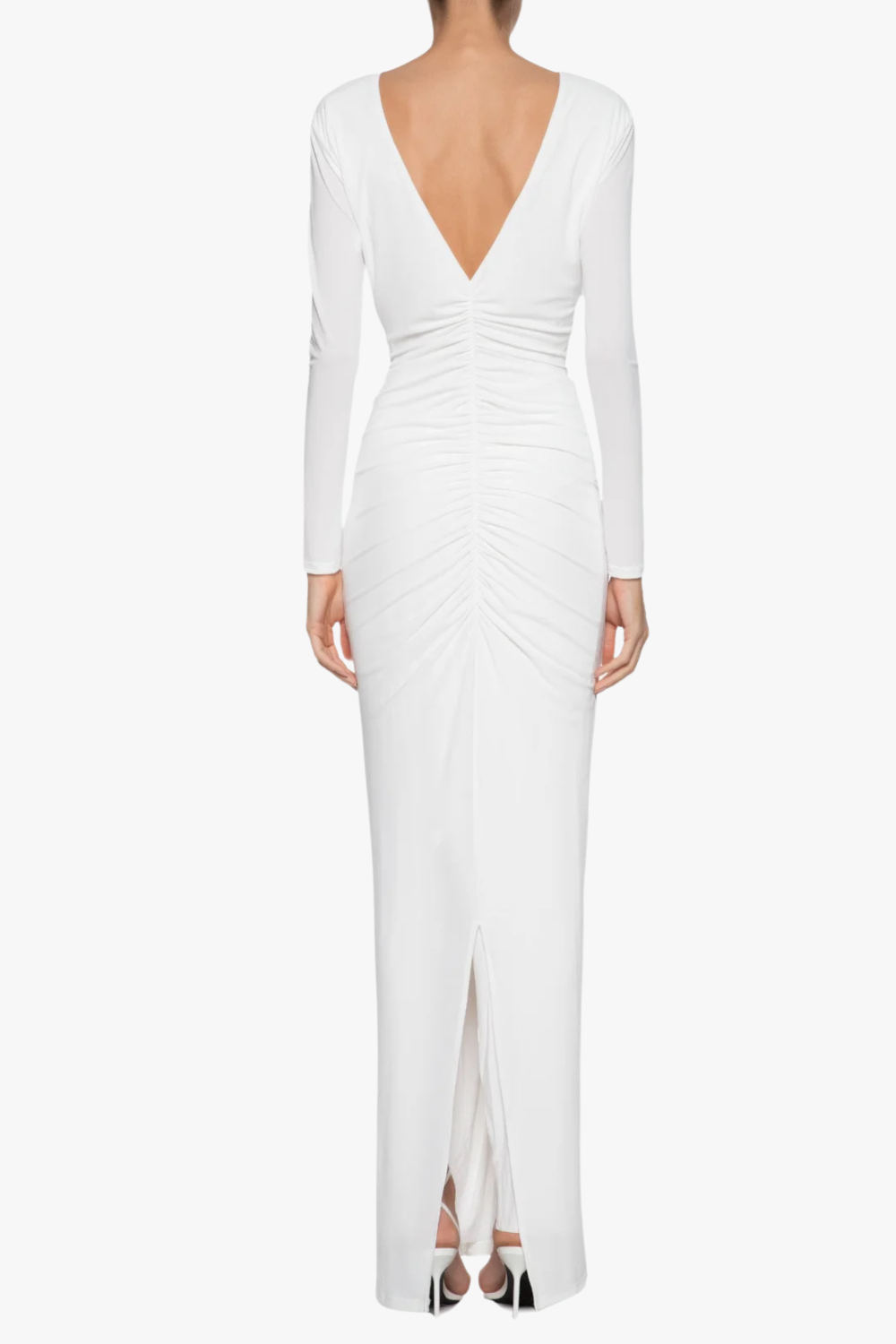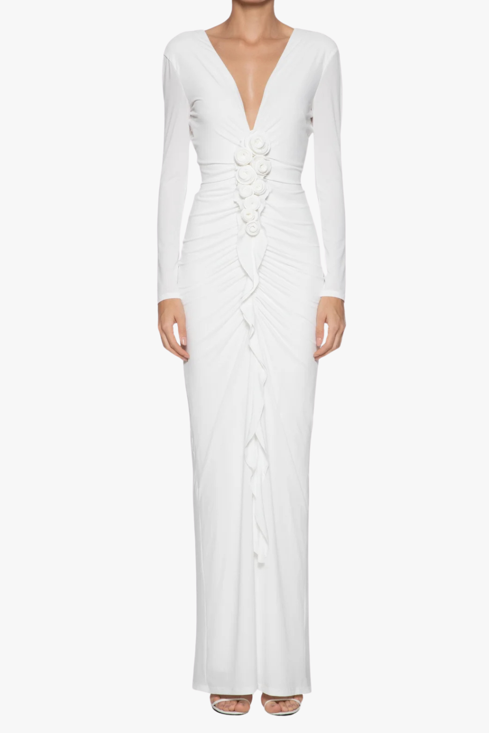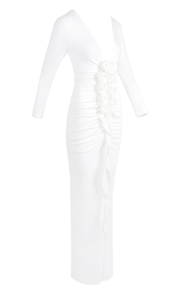 elsa V Neck Flower Ruched maxi Dress in white