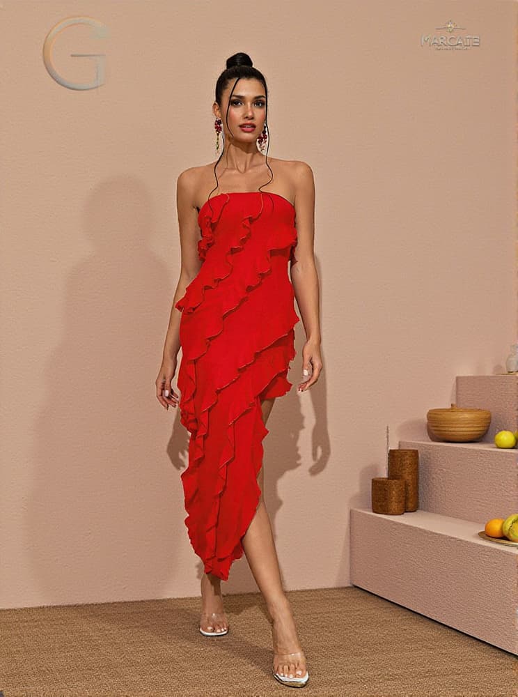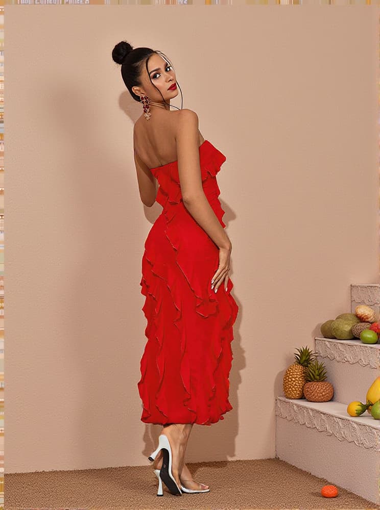 This Elsie Strapless Ruffle Dress is a sophisticated addition to any wardrobe. The strapless design and deep red color offer an elegant look, and the delicate ruffle detailing adds a romantic touch. Perfect for an evening out.
