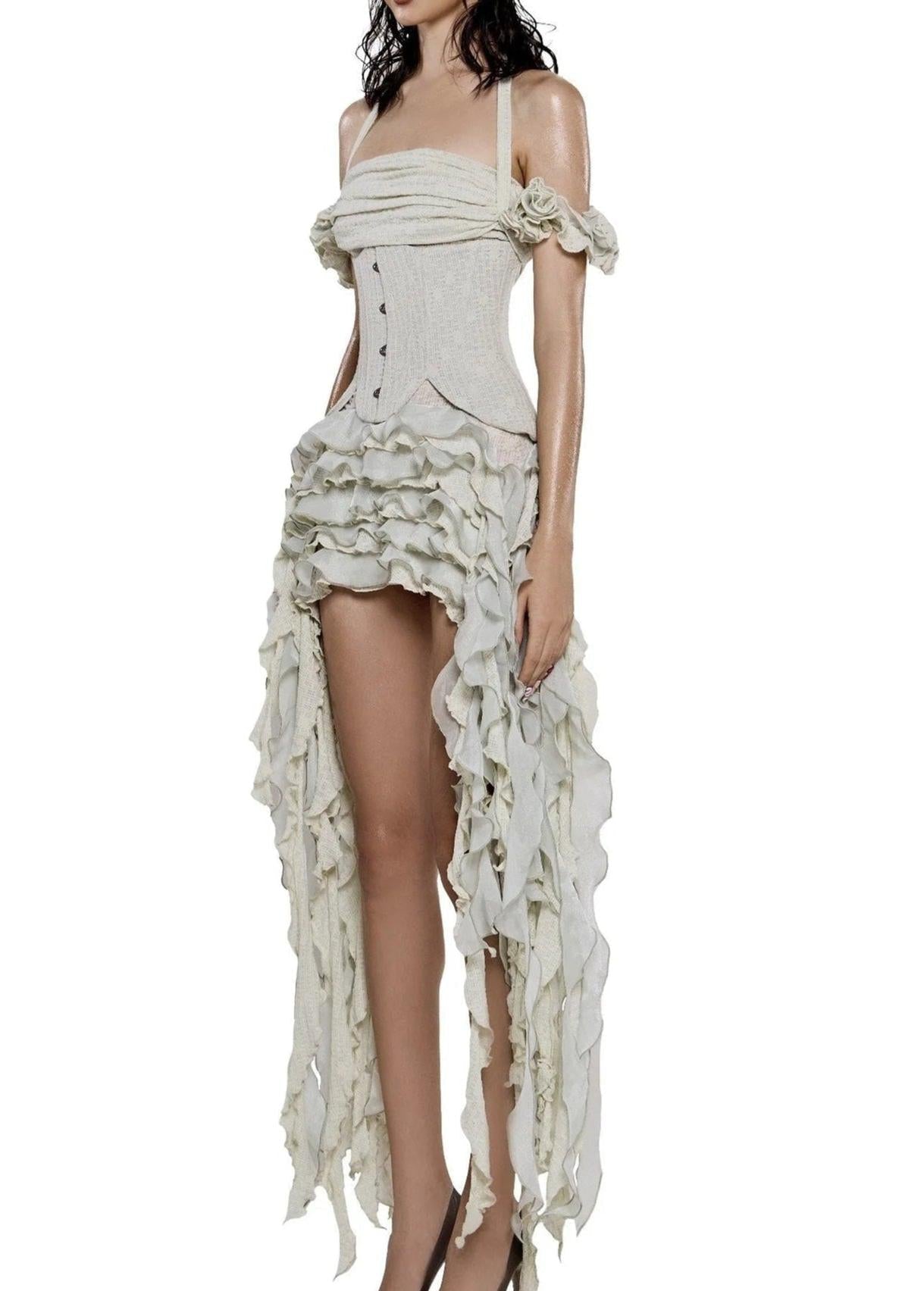 The Elva halter mini dress in beige features intricate three-dimensional floral detailing and an irregular tassel hem, combining elegance with a modern edge. Its halter neckline enhances the silhouette, making it ideal for sophisticated occasions where style and uniqueness are paramount. Crafted to offer both comfort and standout appeal, this dress is a refined choice for those seeking a distinctive yet graceful look.