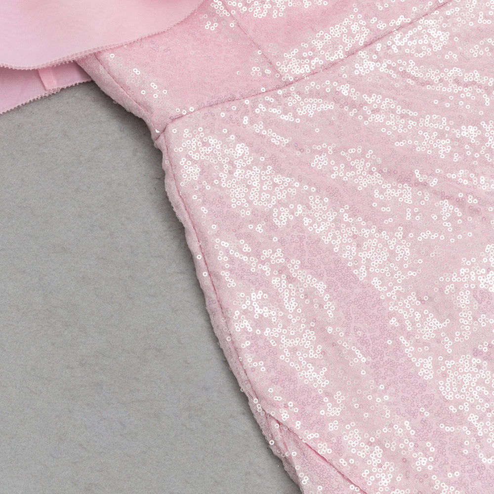 ELVA PINK RUFFLE TRIM HIGH SLIT SEQUIN MIDI DRESS
