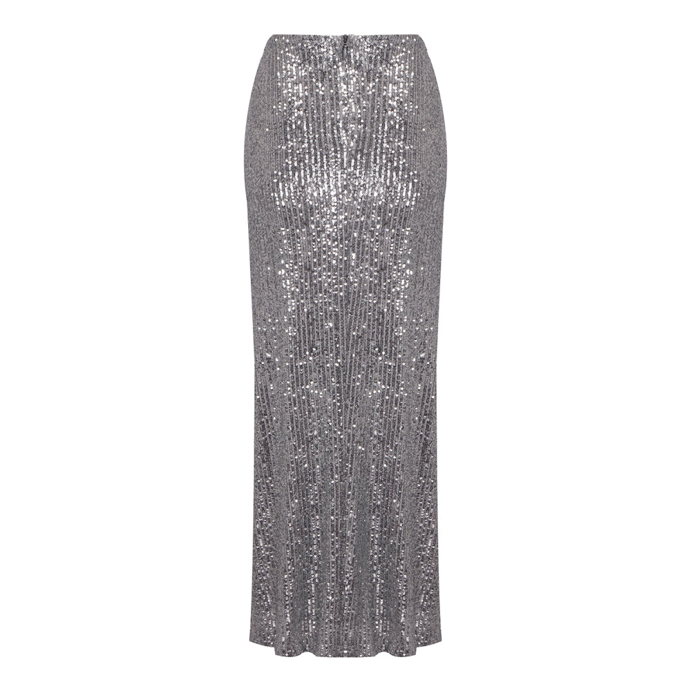 ELVIRA FLORAL-APPLIQUÉ SEQUINED MAXI SKIRT IN SLIVER