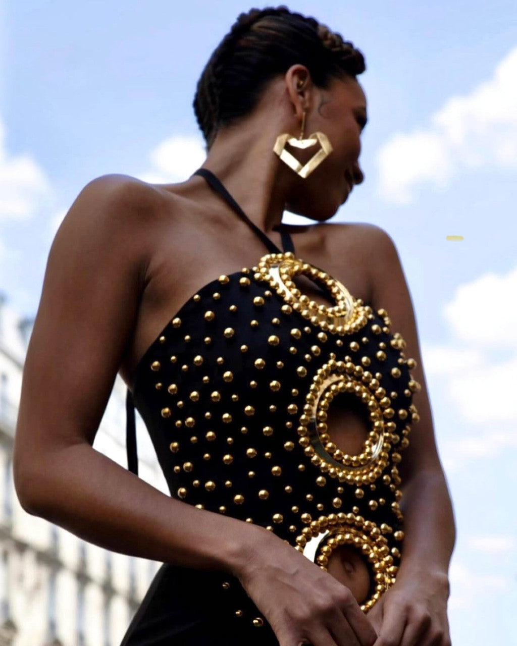 embellished cut out halter maxi dress in black