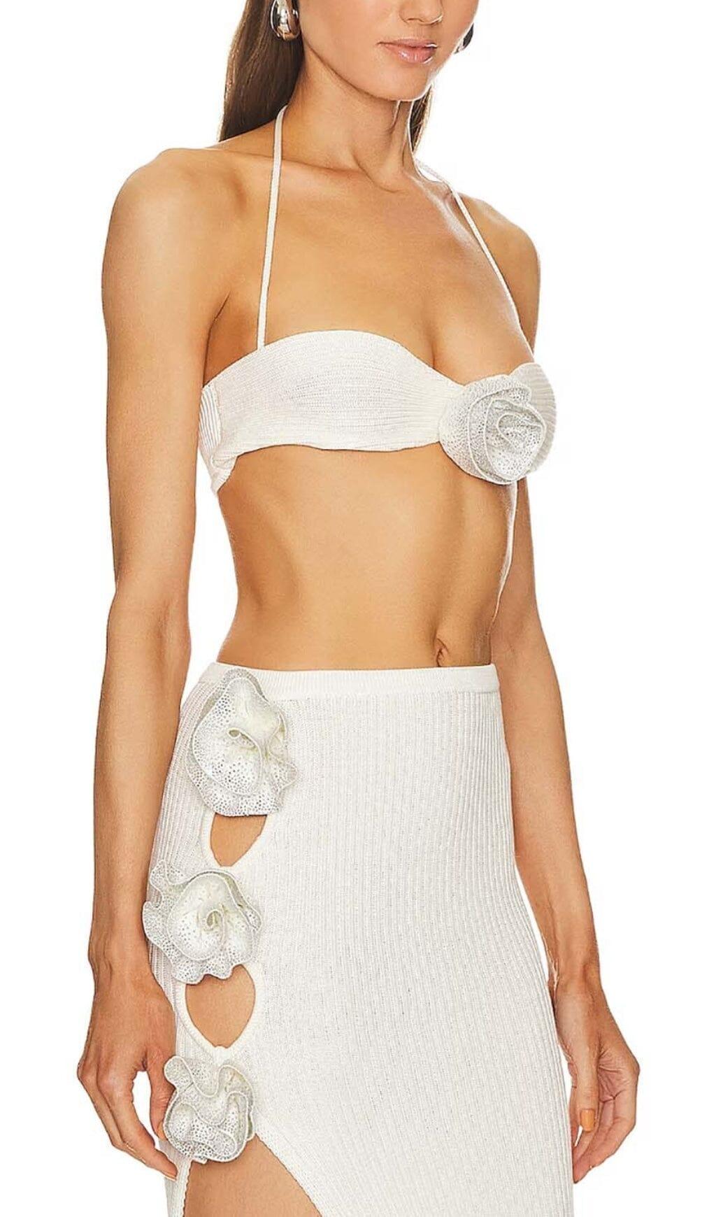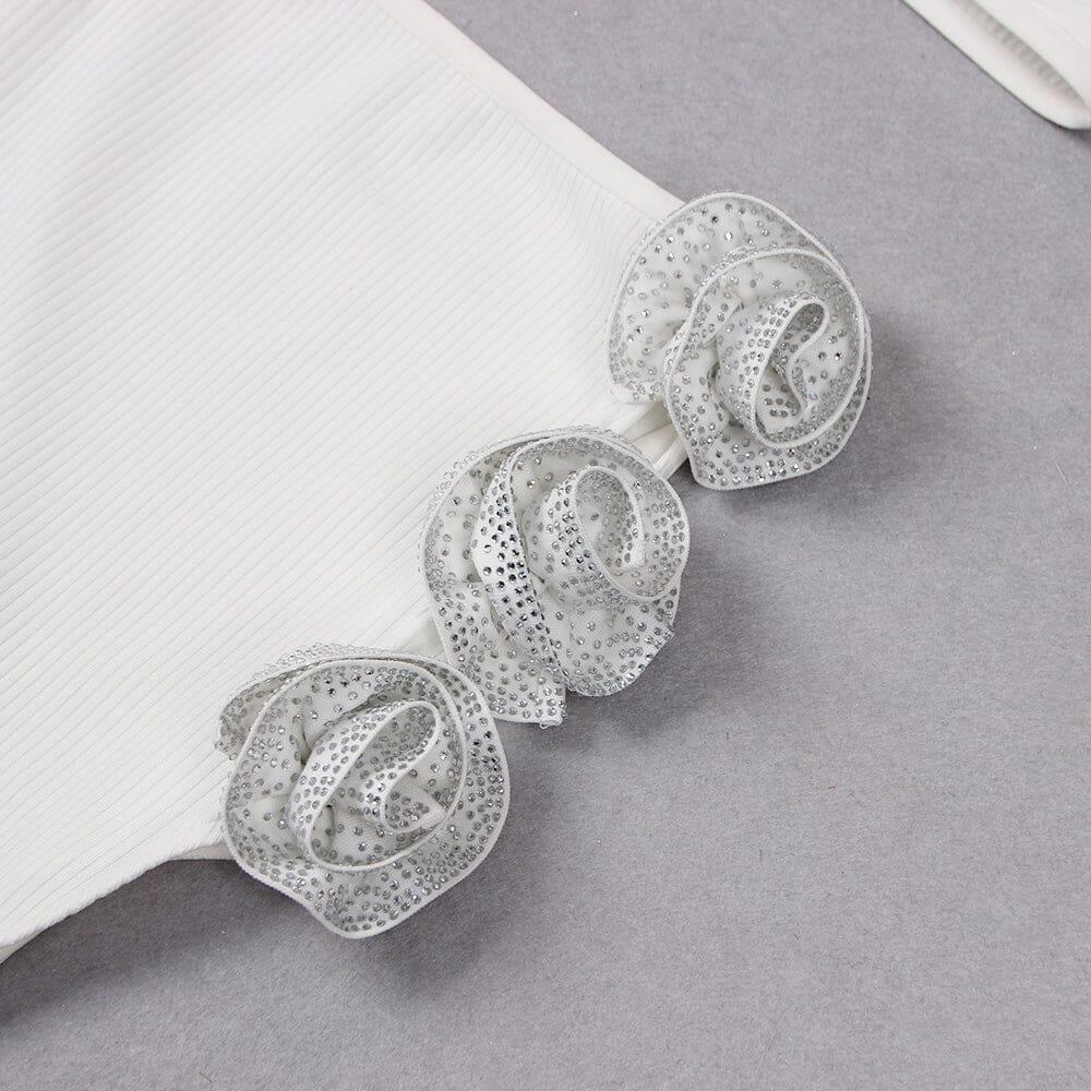 The cropped top features intricate crystal stitching, adding a touch of glamour and sophistication. The high-low dress in crisp white creates a dramatic and angelic look that is sure to turn heads.