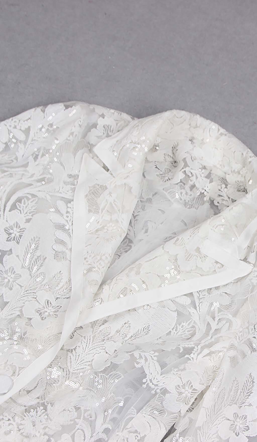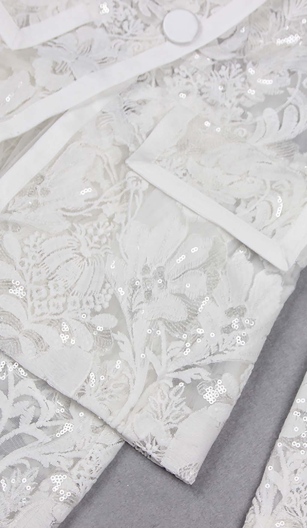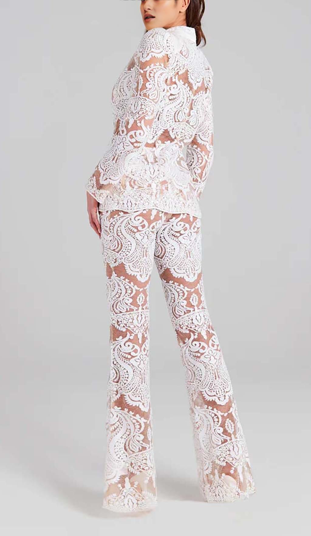 EMBROIDERED LACE MESH JACKET SUIT IN WHITE