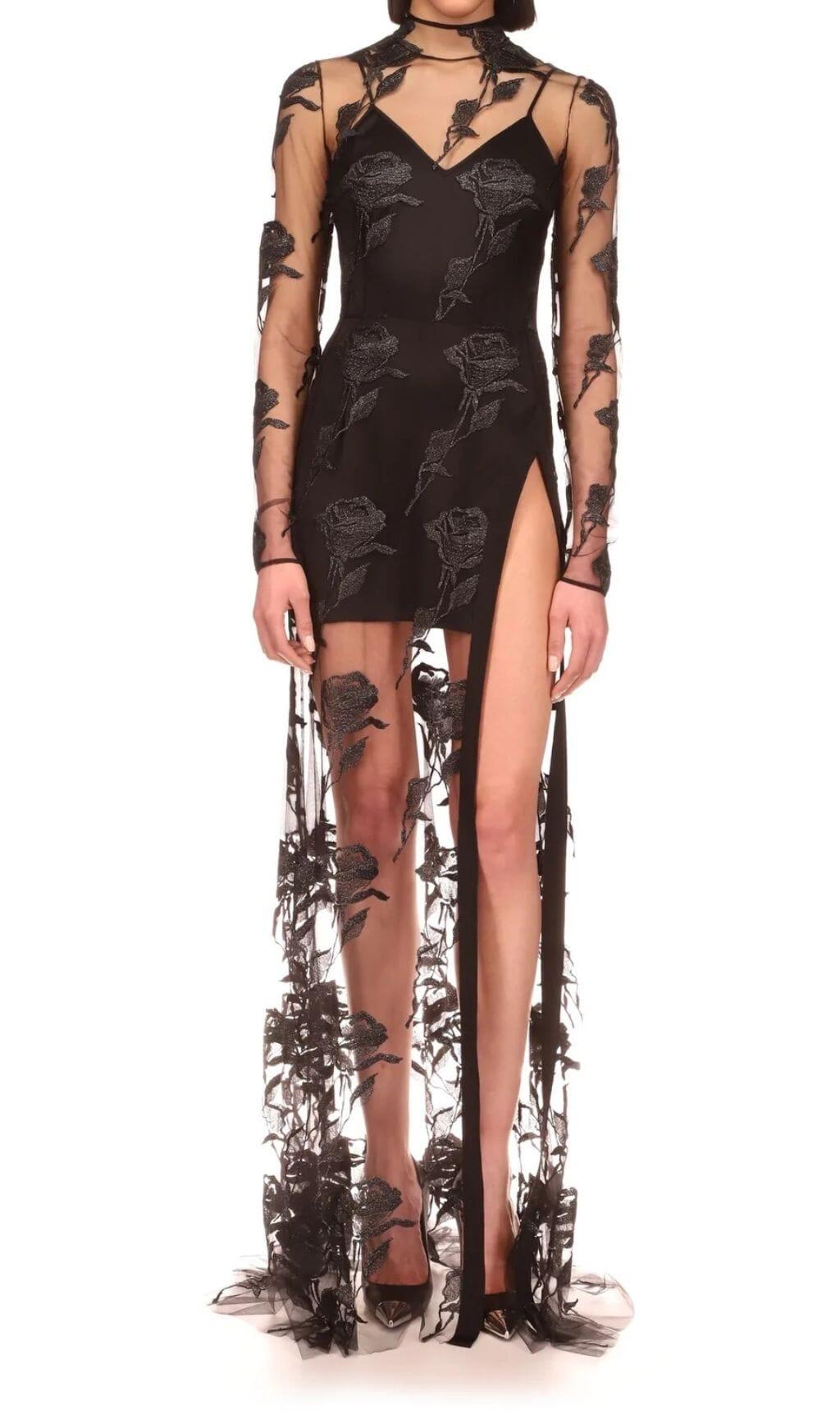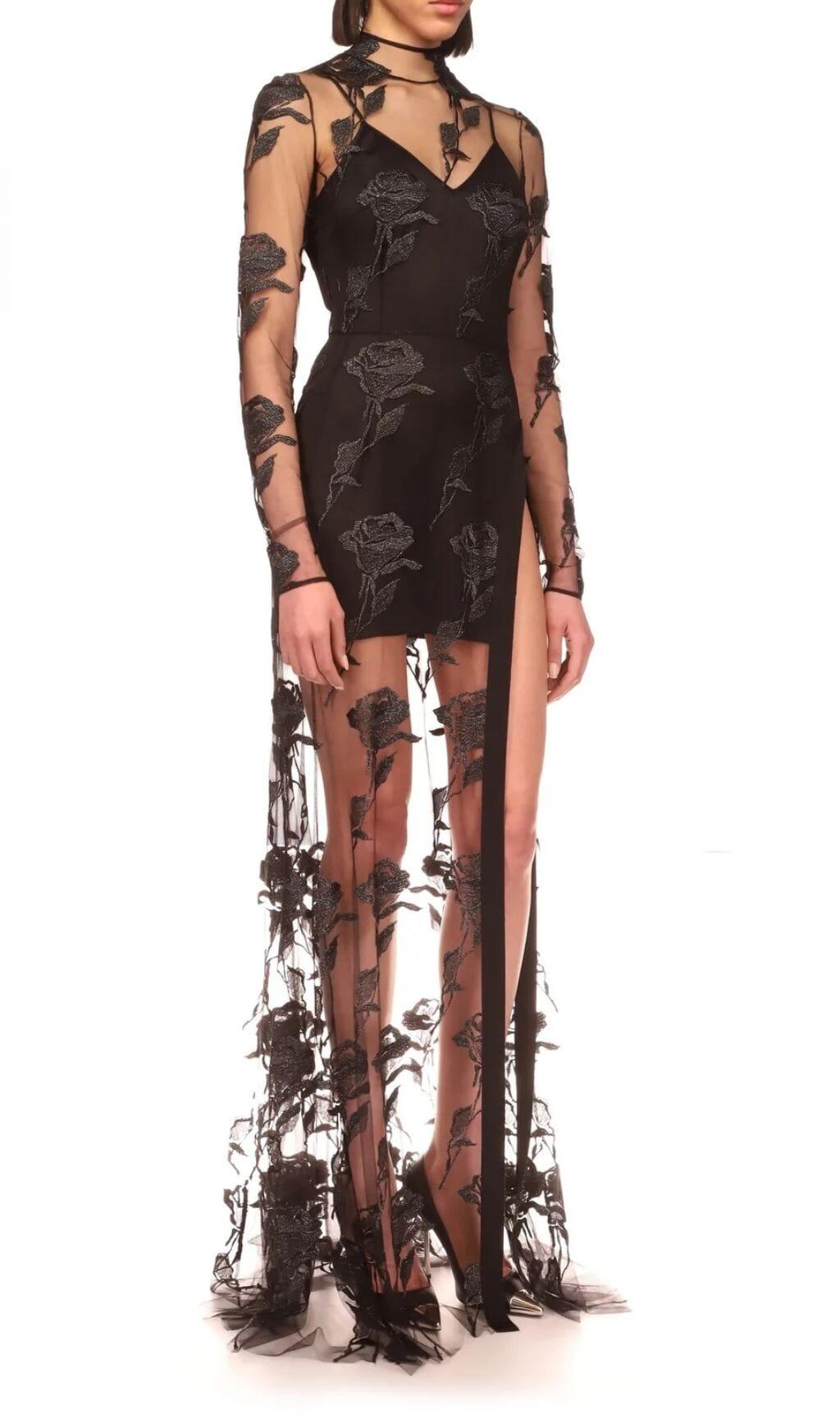 EMBROIDERED MESH FLORAL MAXI DRESS IN BLACK