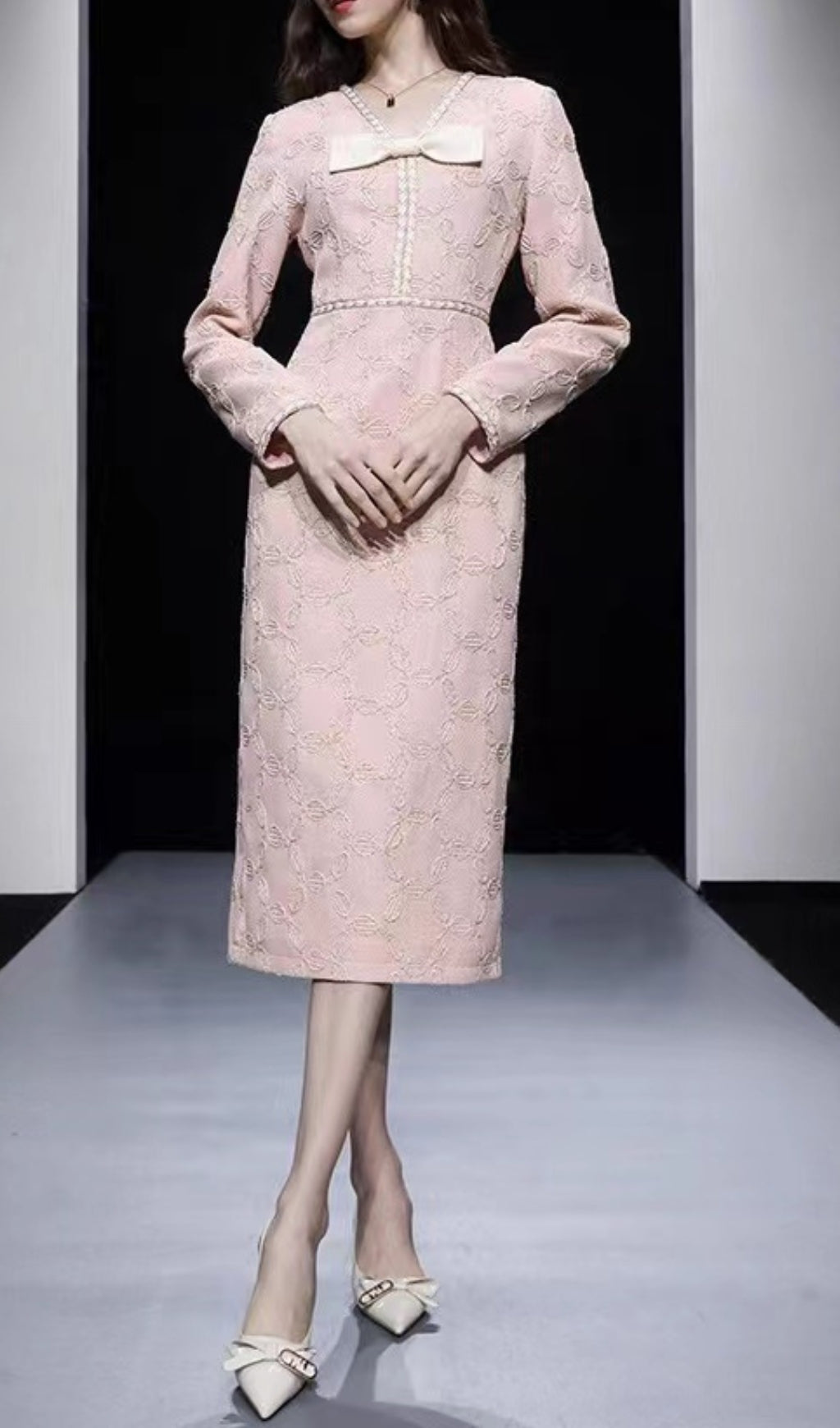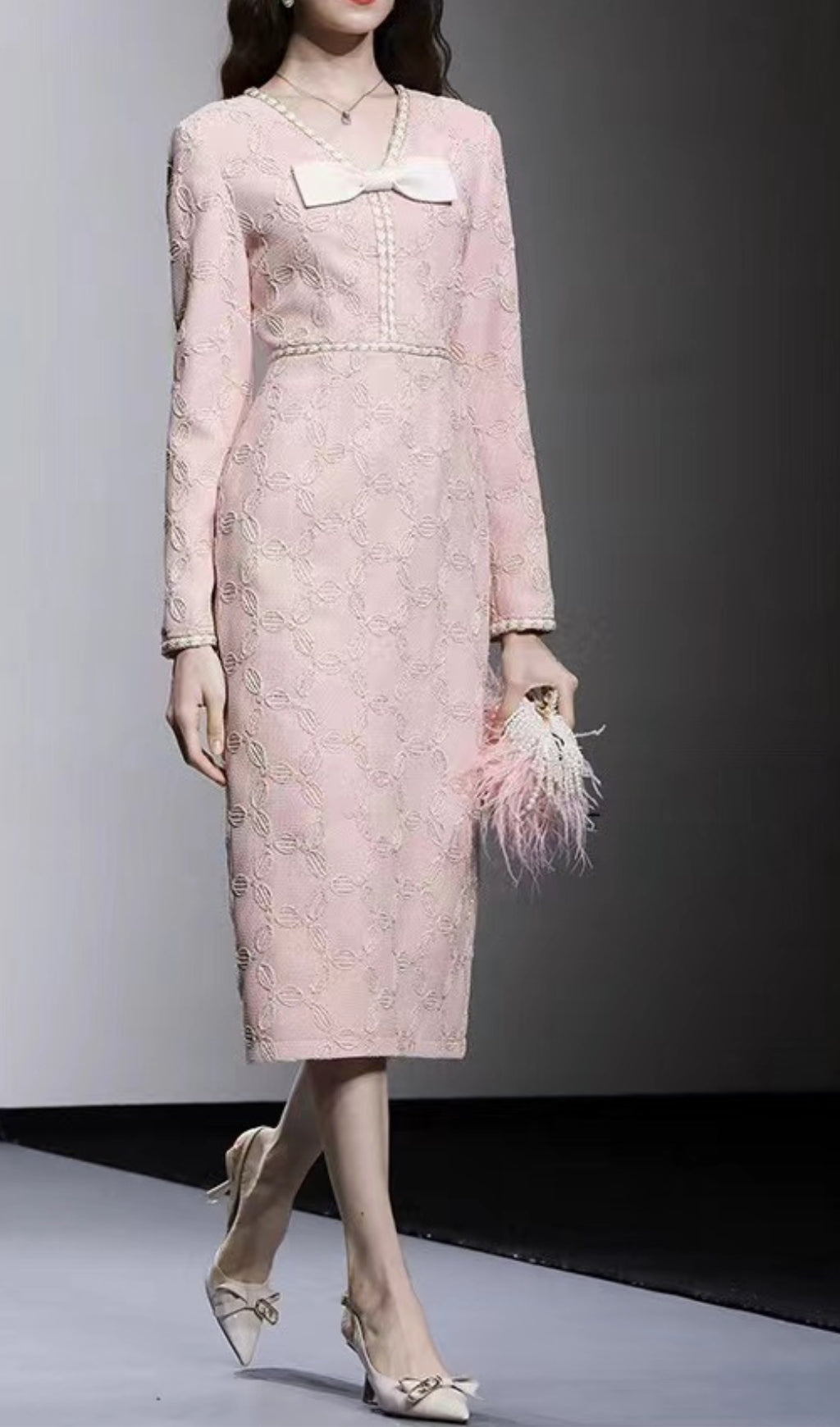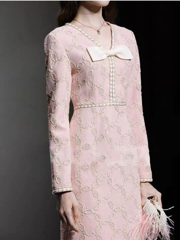 EMBROIDERED V-NECK BOW MIDI DRESS