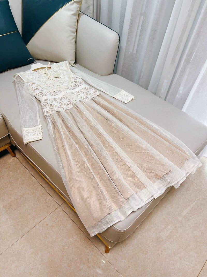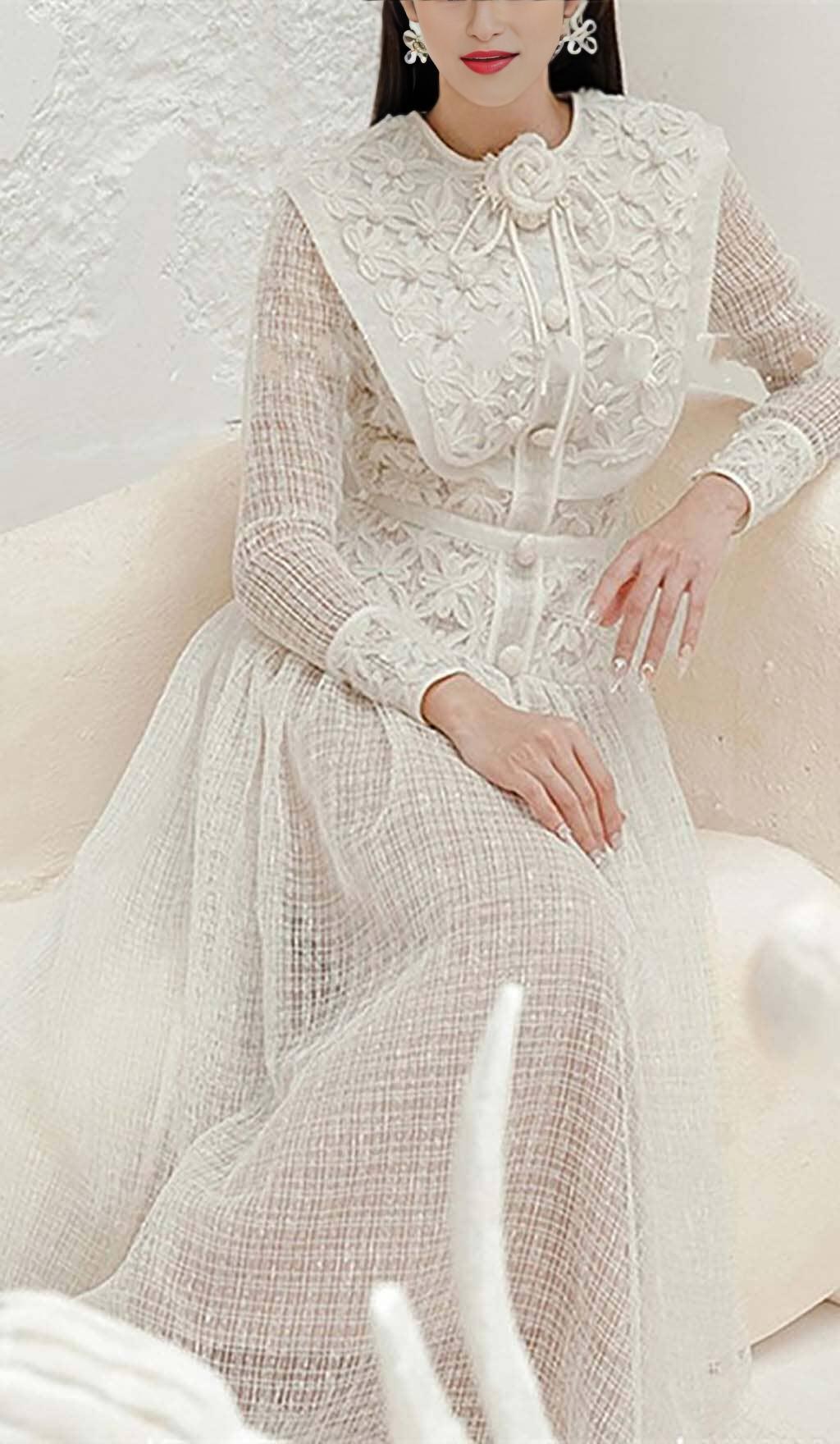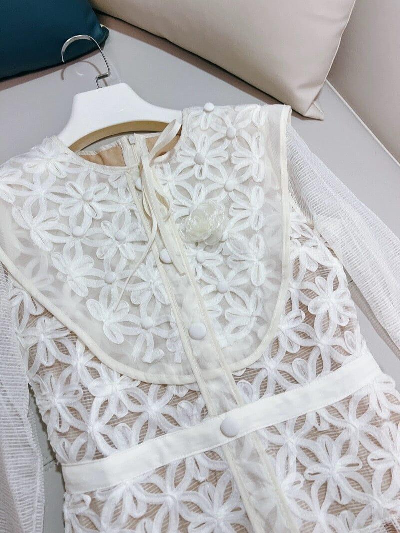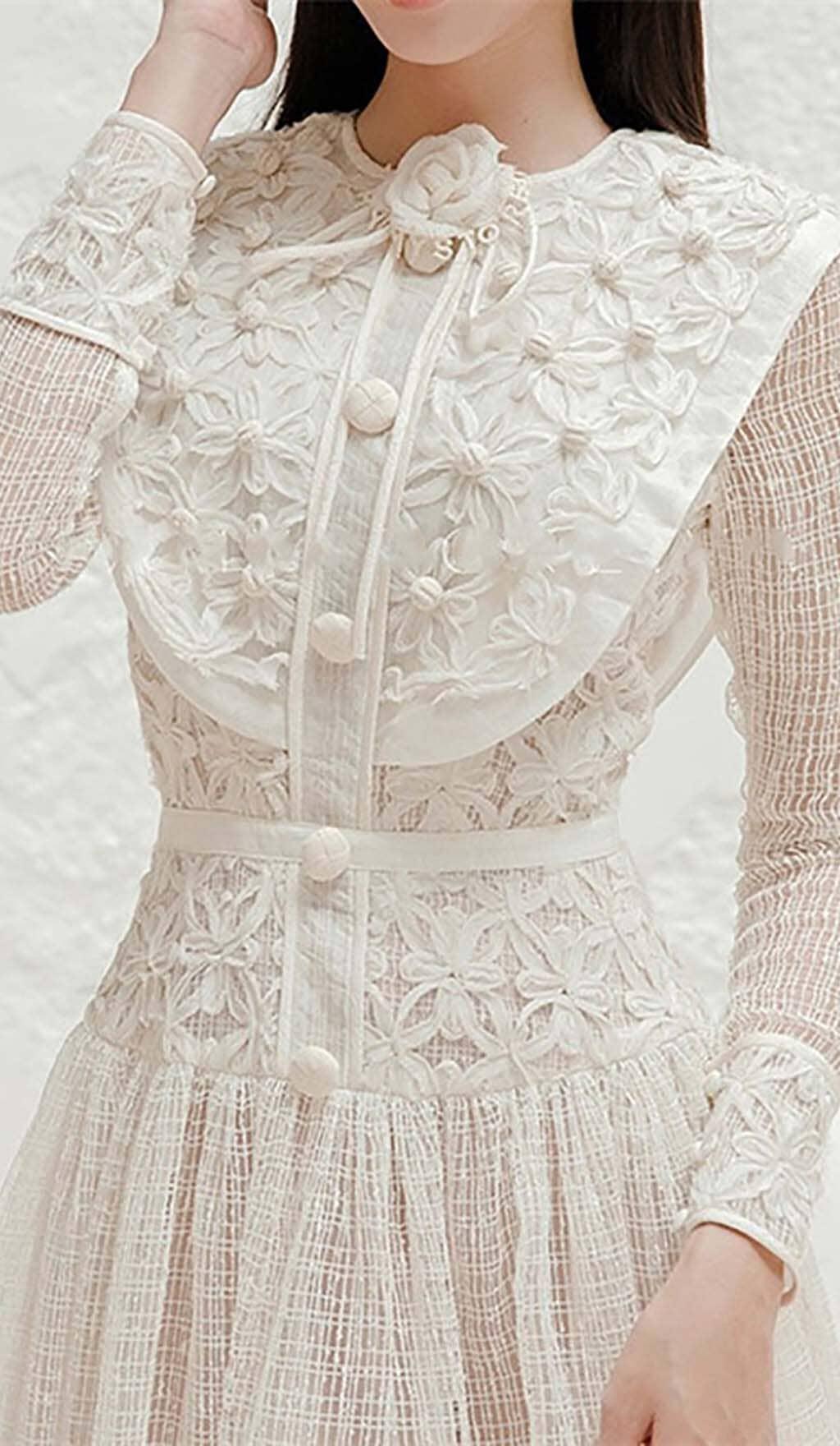 EMBROIDERY LACE LONG SLEEVE MIDI DRESS IN WHITE