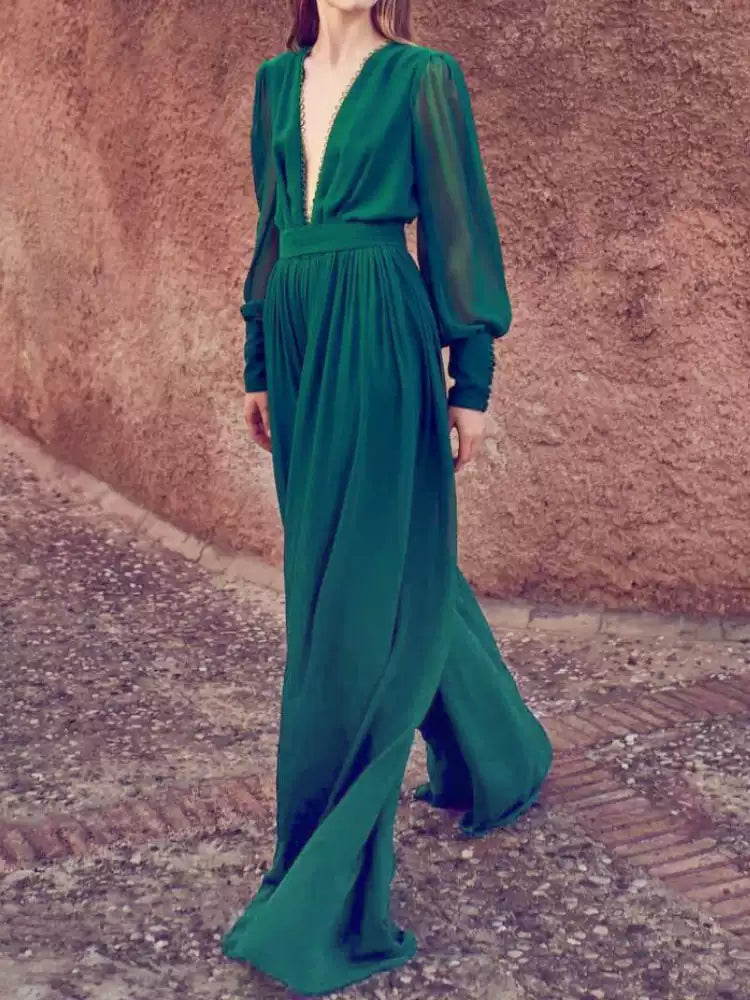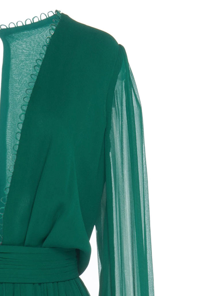 Emerald Green Chiffon Maxi Dress with Sheer Sleeves and Keyhole Back
