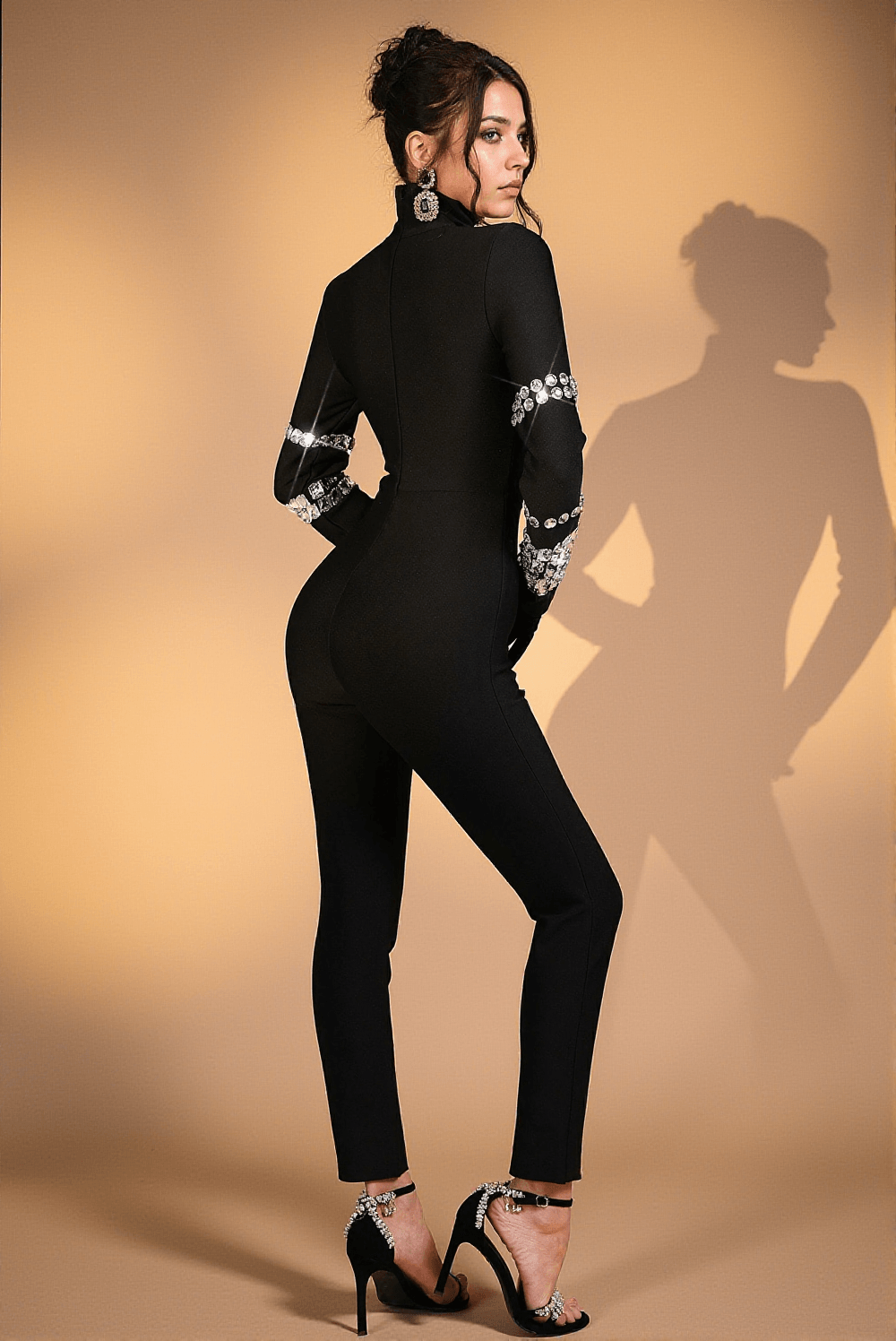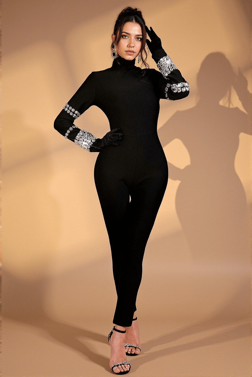 The Emilee Jumpsuit is not just a garment; it's a work of art. Its high neck design and long sleeves provide a sophisticated silhouette, while the rhinestone embellishments add an opulent touch that catches the eye from across the room. The blend of polyester and spandex ensures flexibility and comfort without compromising on style.