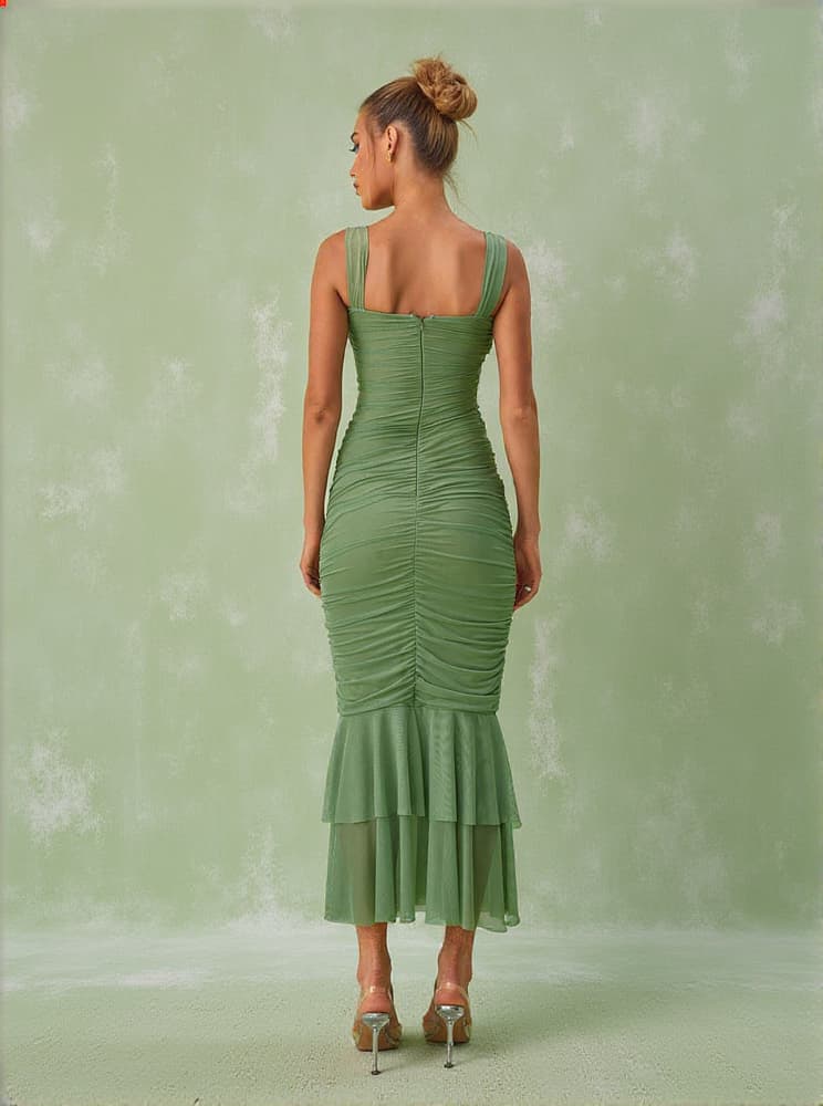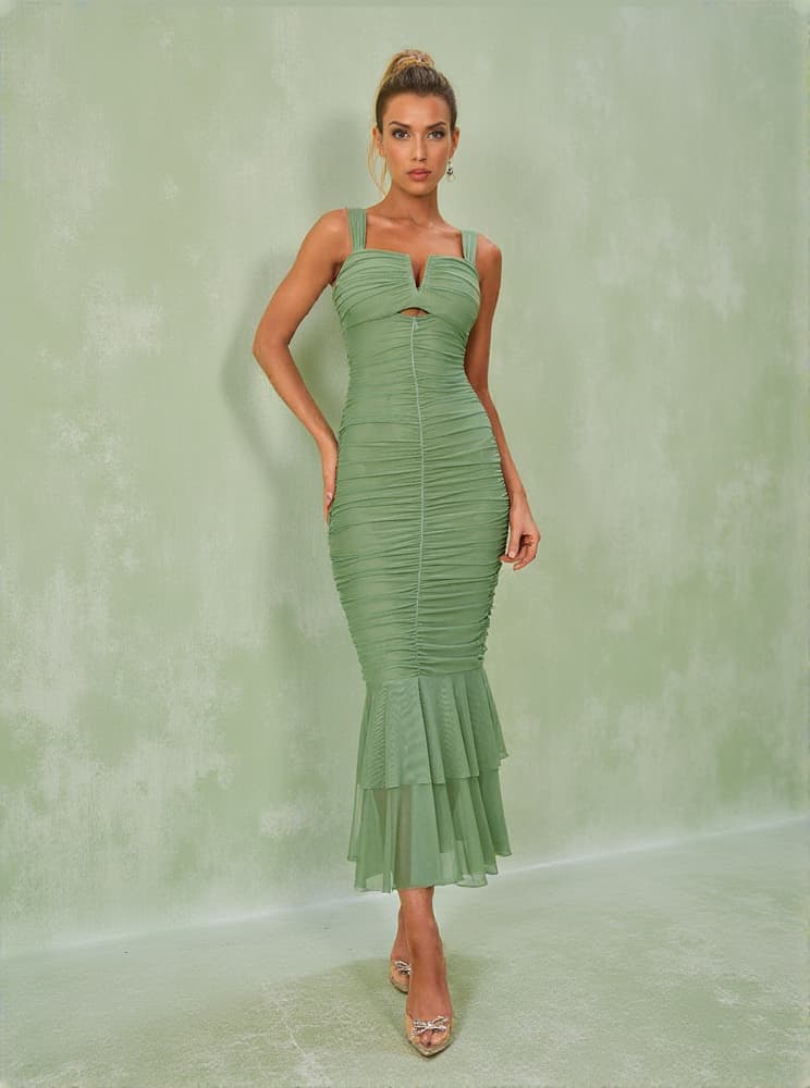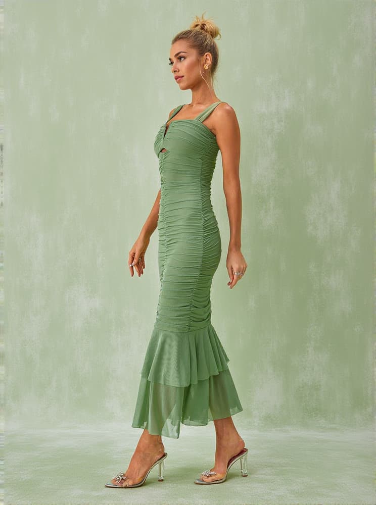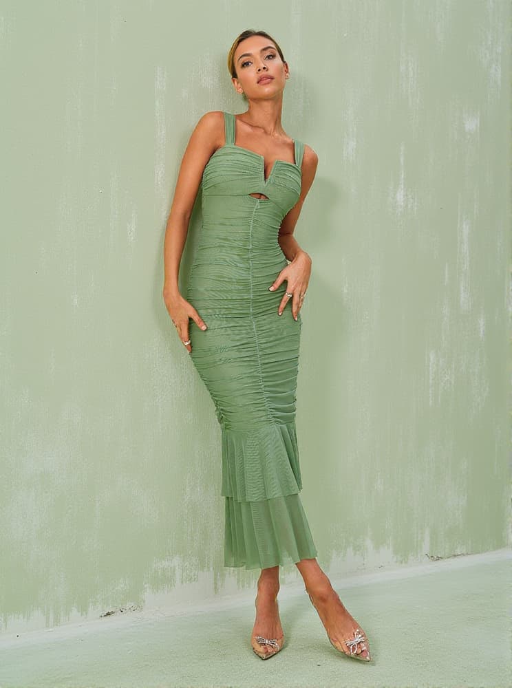 This Eri Ruched Mesh Maxi Dress In Green is the perfect combination of style and comfort. Its maxi length and subtle ruching create an elegant silhouette that is further enhanced by the delicate mesh detailing. This dress is perfect for any special occasion, guaranteeing you look and feel your best.