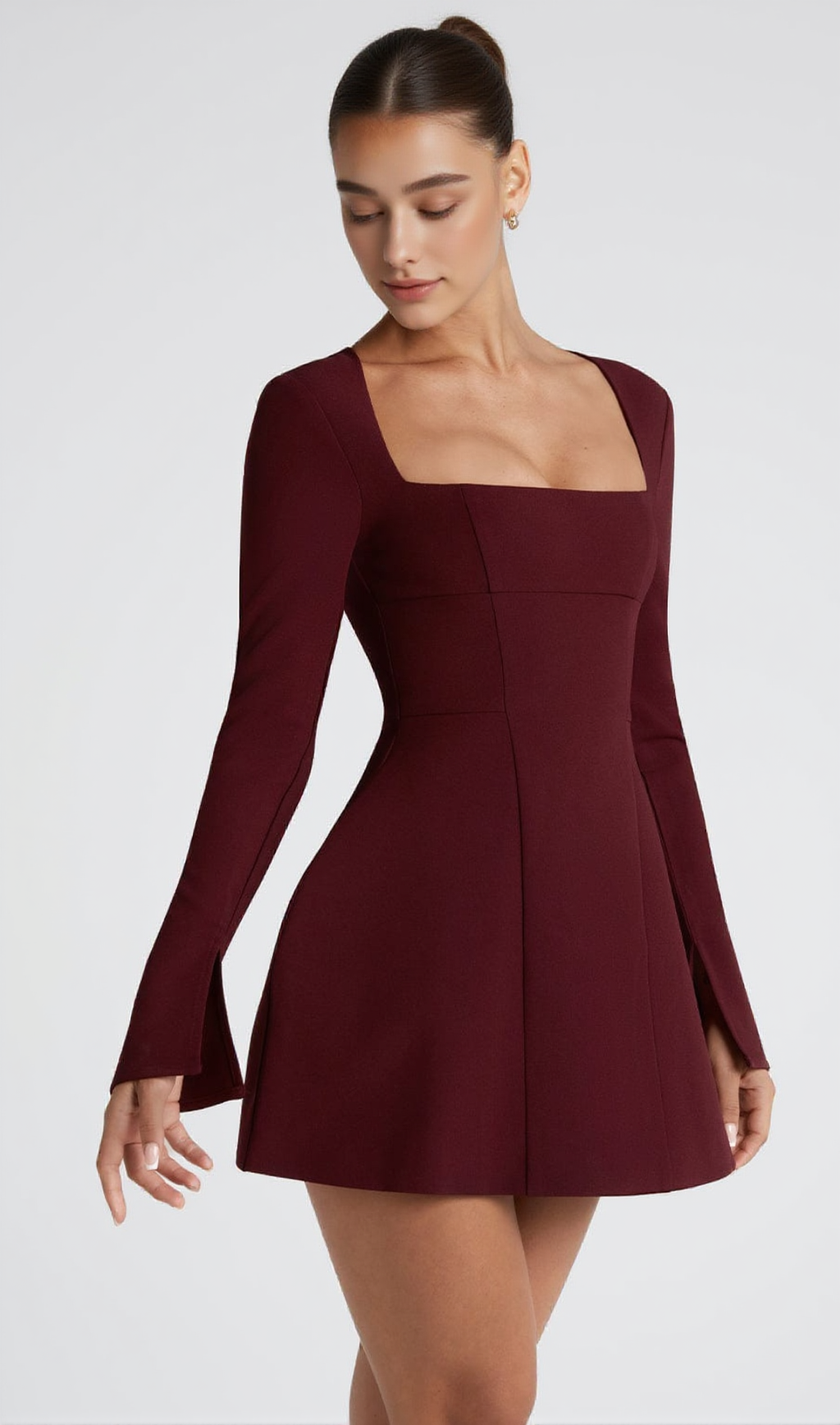 The Esme Mini Dress in Cherry Lacquer is the perfect blend of sophistication and playful charm. Crafted from non-stretch crepe, this mini-length dress features a square neckline that beautifully frames the décolletage, while long sleeves with split cuffs add an elegant touch. The standout bubble-shaped skirt creates a voluminous, flirty silhouette, making it a statement piece for any occasion.