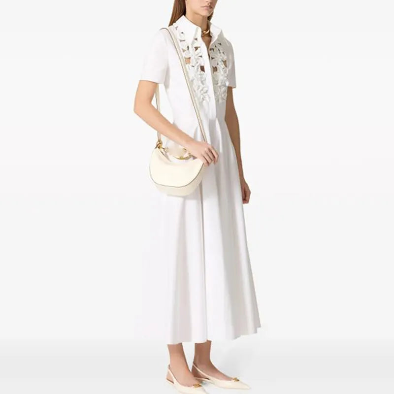 This elegant dress features intricate floral designs and short sleeves, providing both style and comfort. It festooned in a chain of sun-worshipping daisies entwining across the chest, sensually revealing flickers of skin beneath.Made for any occasion, this maxi dress is perfect for those looking to add a touch of sophistication to their wardrobe.
