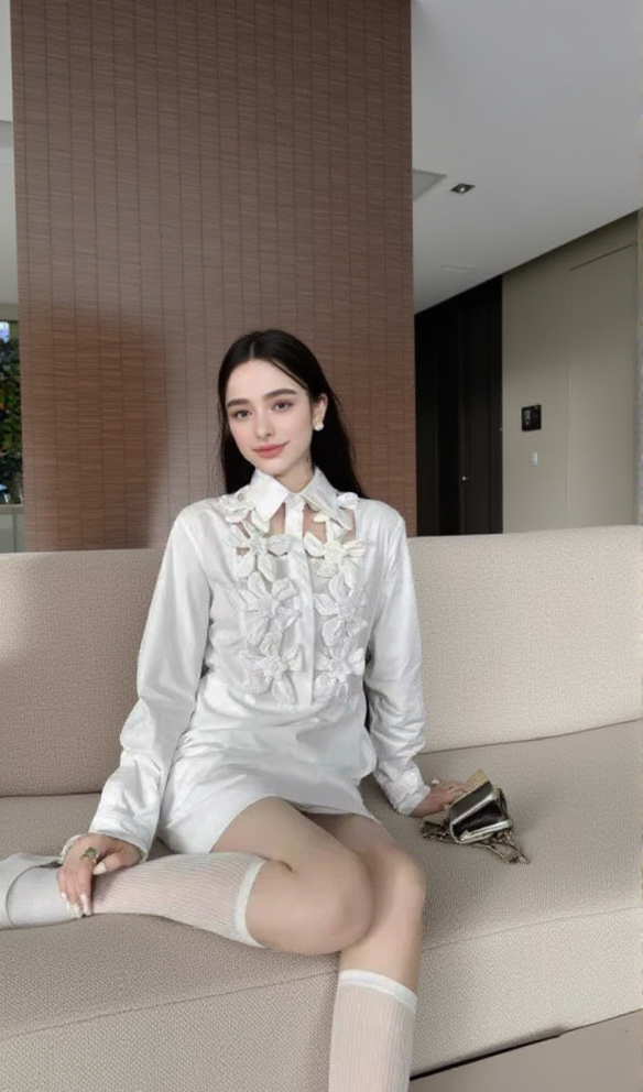This Shirtdress features intricate floral detailing and a comfortable, lightweight design, festooned in a chain of sun-worshipping daisies entwining across the chest, sensually revealing flickers of skin beneath. With long sleeves and a flattering mini length, this dress is perfect for any occasion. Stay stylish and comfortable with this must-have addition to your wardrobe.