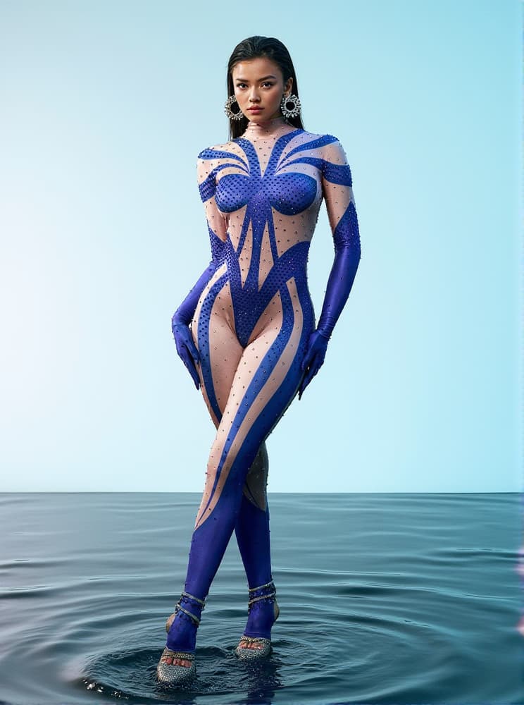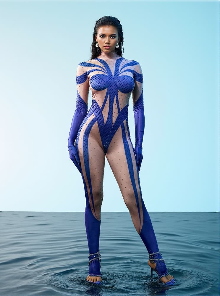 Fabian Rhinestone Printed Gloves Jumpsuit In Blue