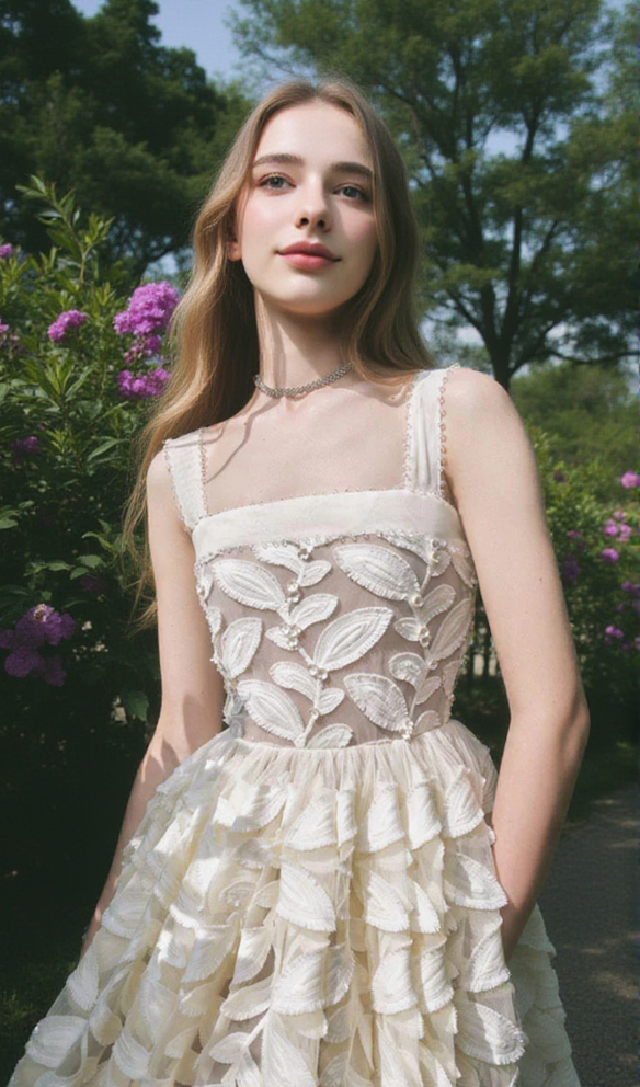 • Special Features: Floral lace patterns, Beaded neckline and straps, 3D white floral embellishments on the bodice, Back zipper