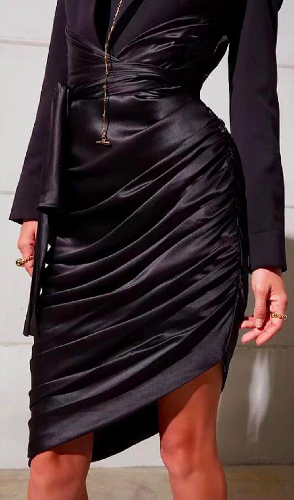 What sets our dress apart is the perfect combination of two different styles. The collision of the rigid suit collar with the draping satin dress creates a distinctive and stylish look that is sure to turn heads. The naturally accumulated wrinkles not only add a romantic French touch but also cleverly cover any excess fat around the waist, enhancing your graceful posture.