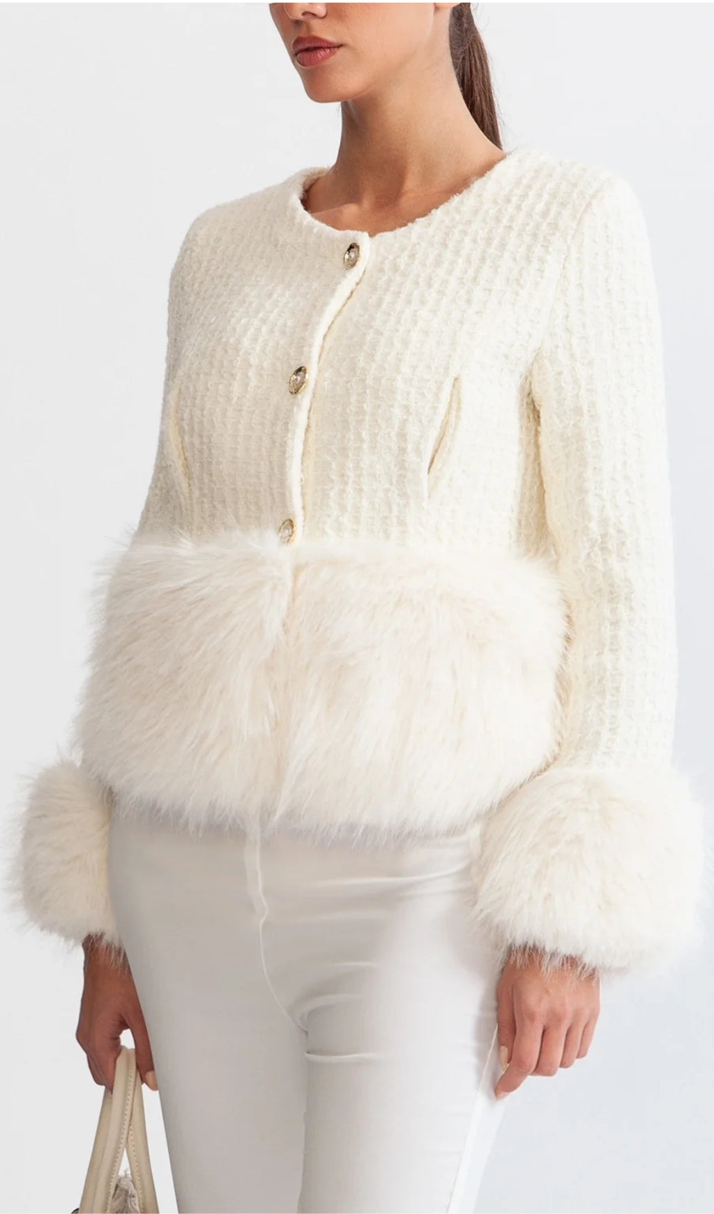 Experience the luxury and allure of this Faux Fur Coat with Wool Blend in White. Crafted from a sumptuous wool blend, this classic coat features jewel buttons, lateral pockets, and faux fur sleeves. Embrace the exquisite look of this timeless piece.