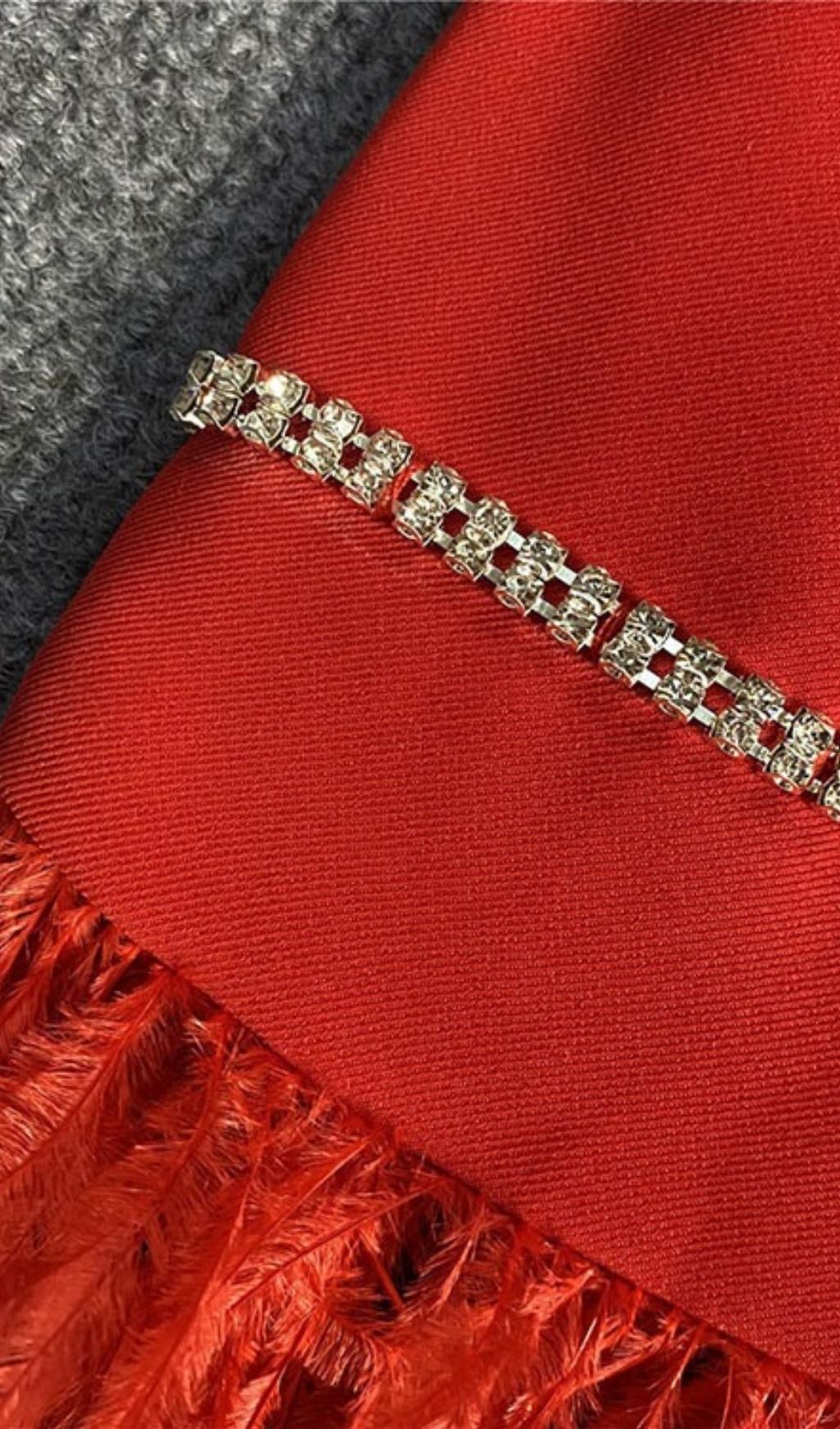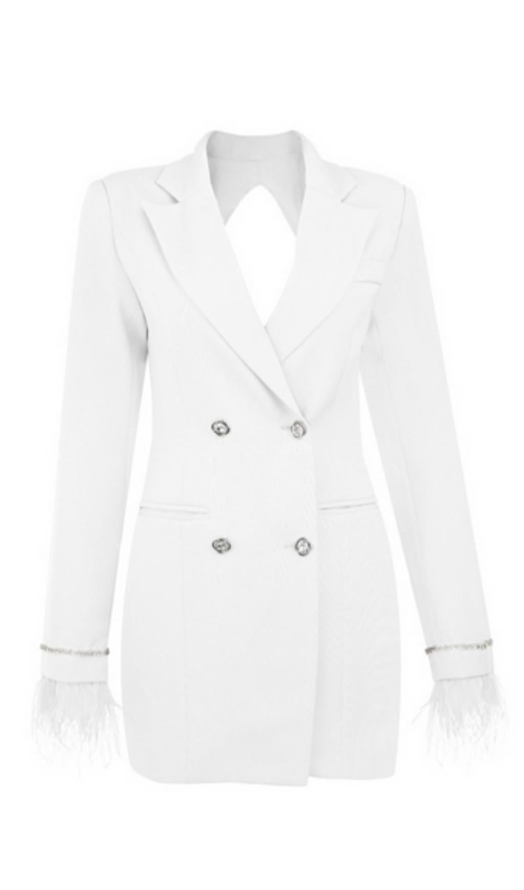 Introducing our Feather Backless Suit Mini Dress, the ultimate statement piece that will make you the center of attention. With its double-breasted design and sleeve feather detail, this dress exudes sexiness and sophistication. And the best part? It's backless, adding an extra touch of allure to your look.