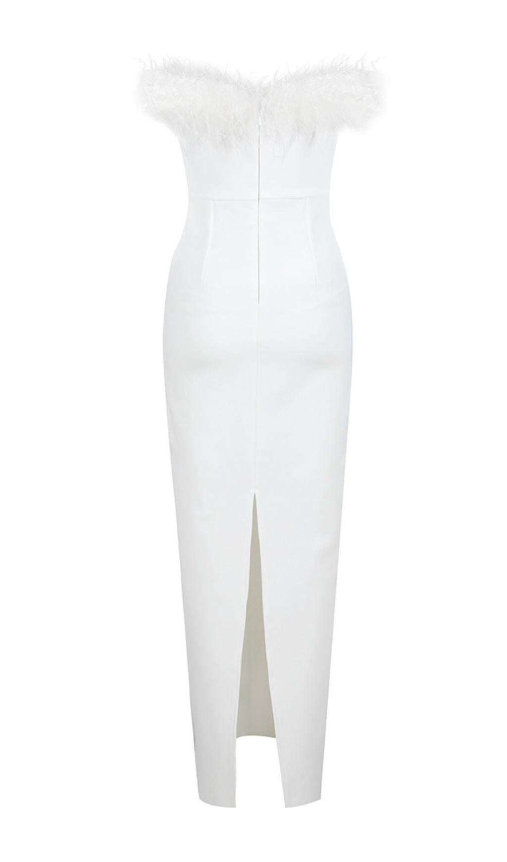 FEATHER BODYCON MAXI DRESS IN WHITE