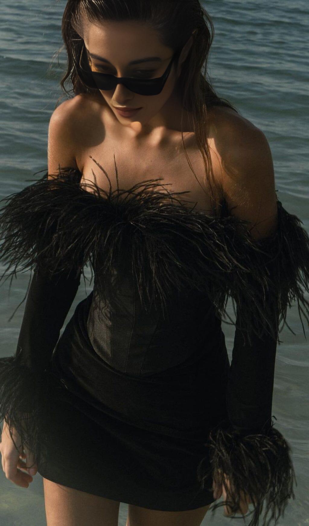 FEATHER CORSET MINI DRESS IN BLACK