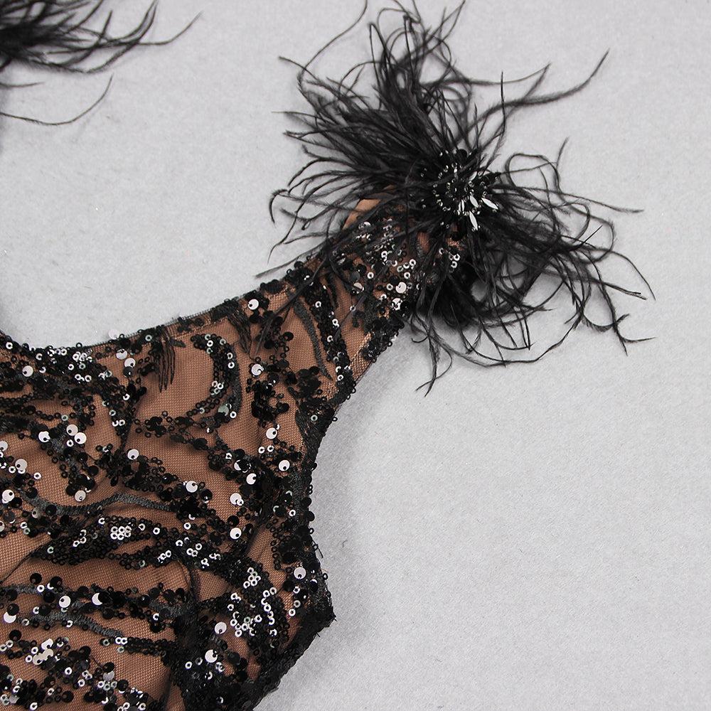This bold and daring dress features intricate sequin detailing and delicate feather accents. Perfect for a night out, this dress will make you feel confident and stylish.
