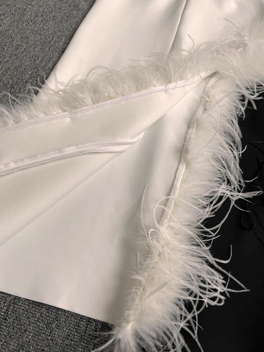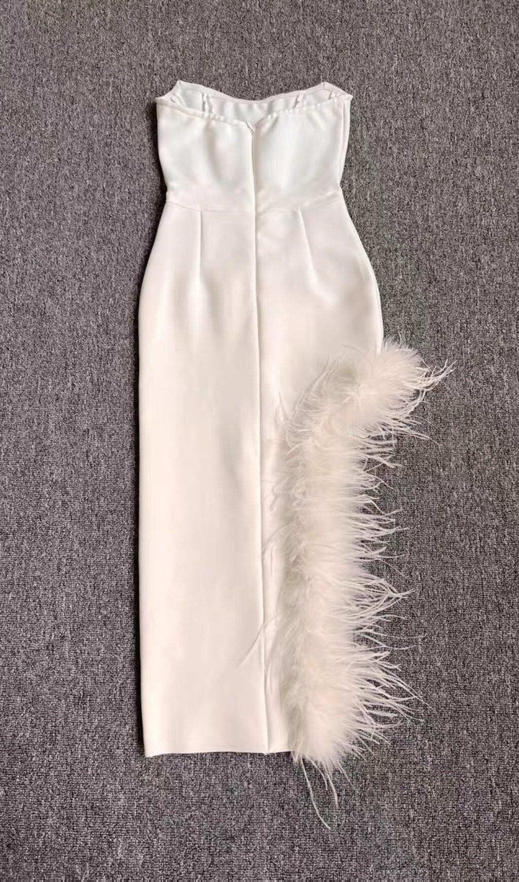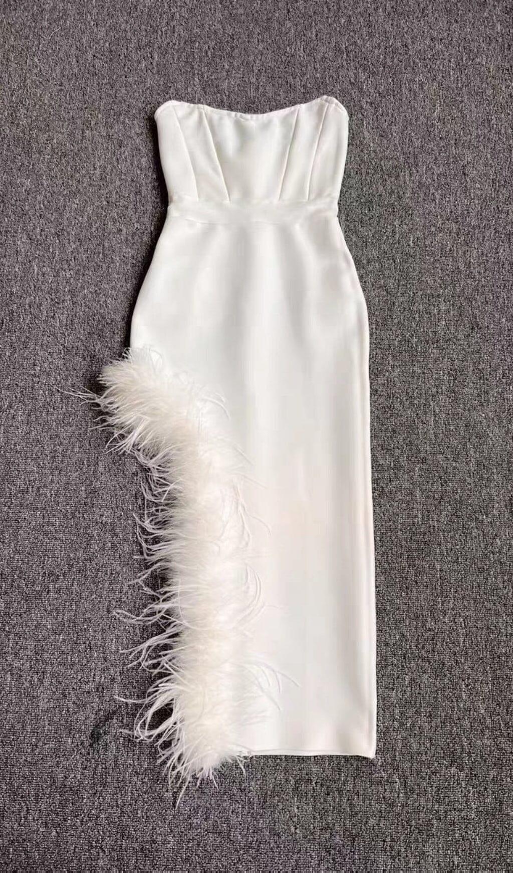 STRAPLESS FEATHER MIDI DRESS IN WHITE