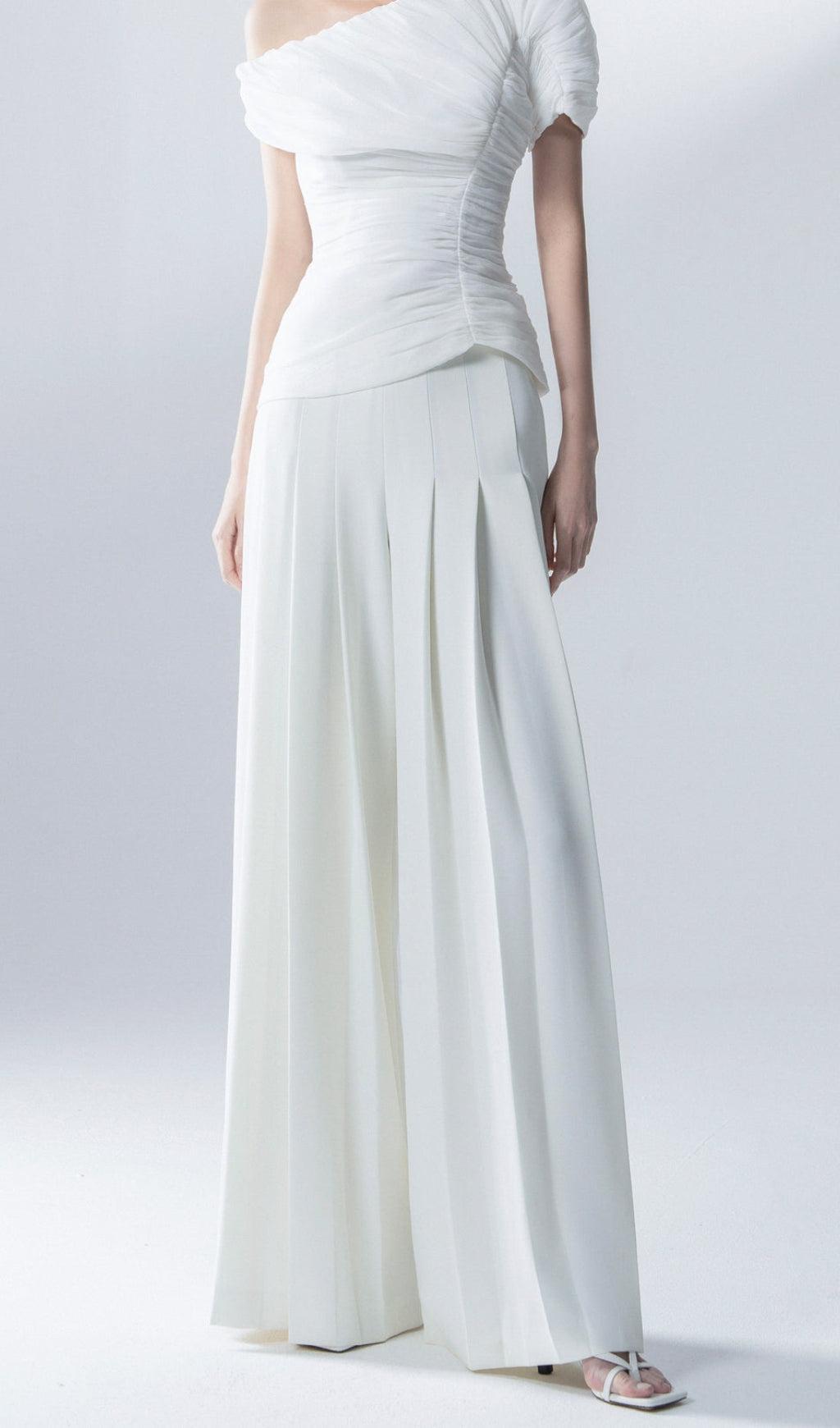 WHITE FEATHER PLEATED TWO PIECES SUIT