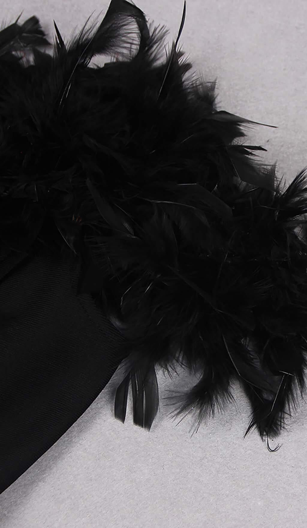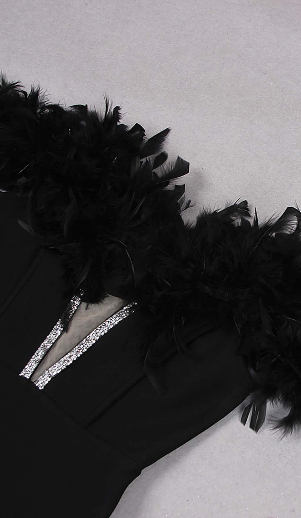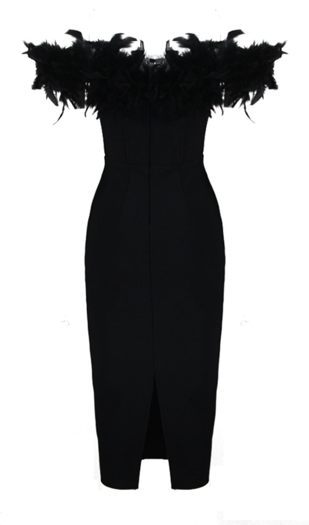 FEATHER PLUNGE MIDI DRESS IN BLACK