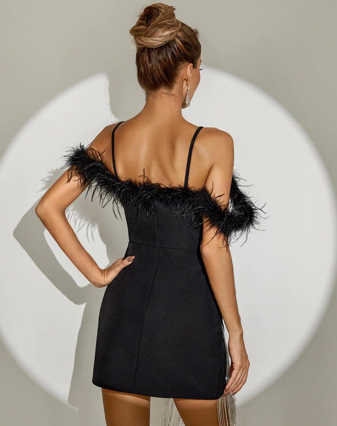 FEATHER STRAP DIAMOND CHAIN MINI DRESS IN BLACK