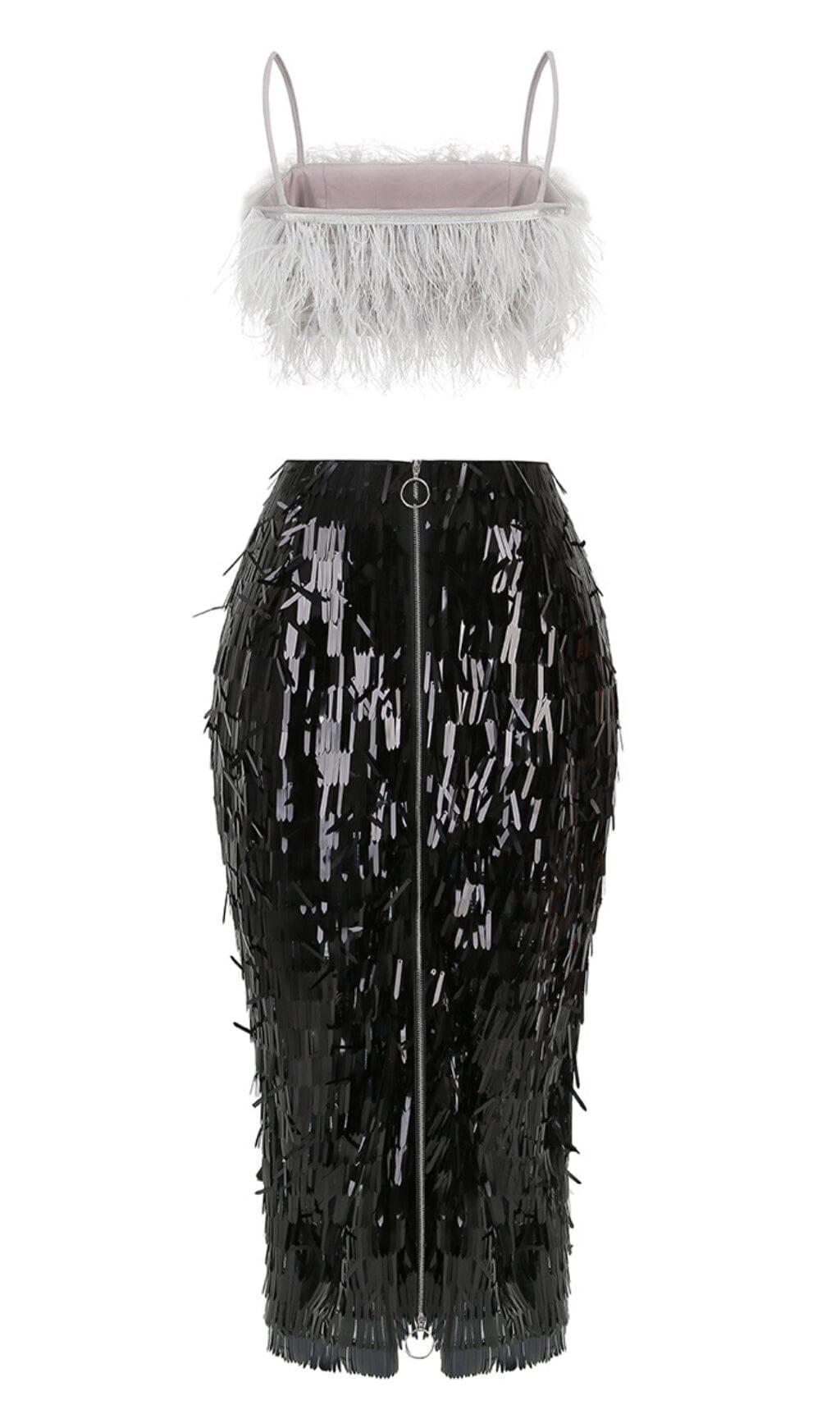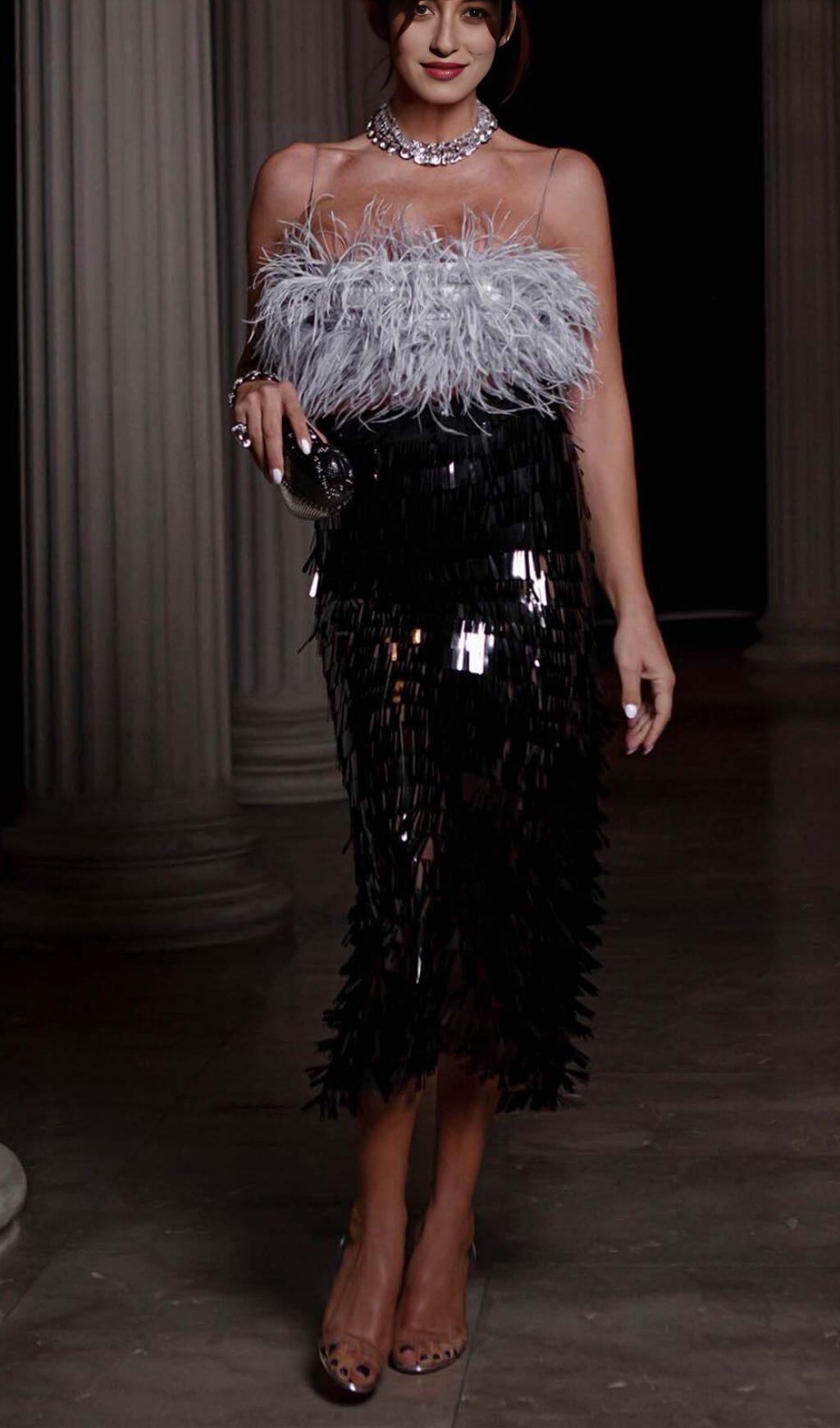 FEATHER TOP SEQUIN MIDI DRESS IN BLACK