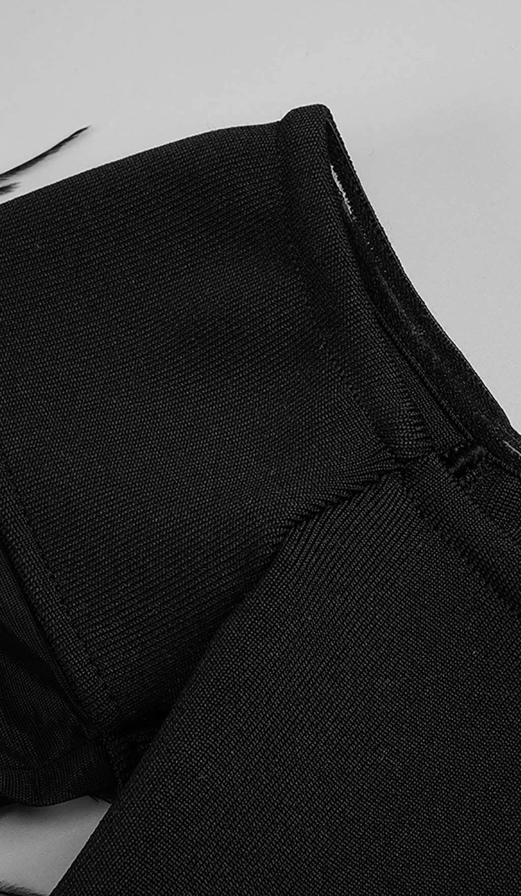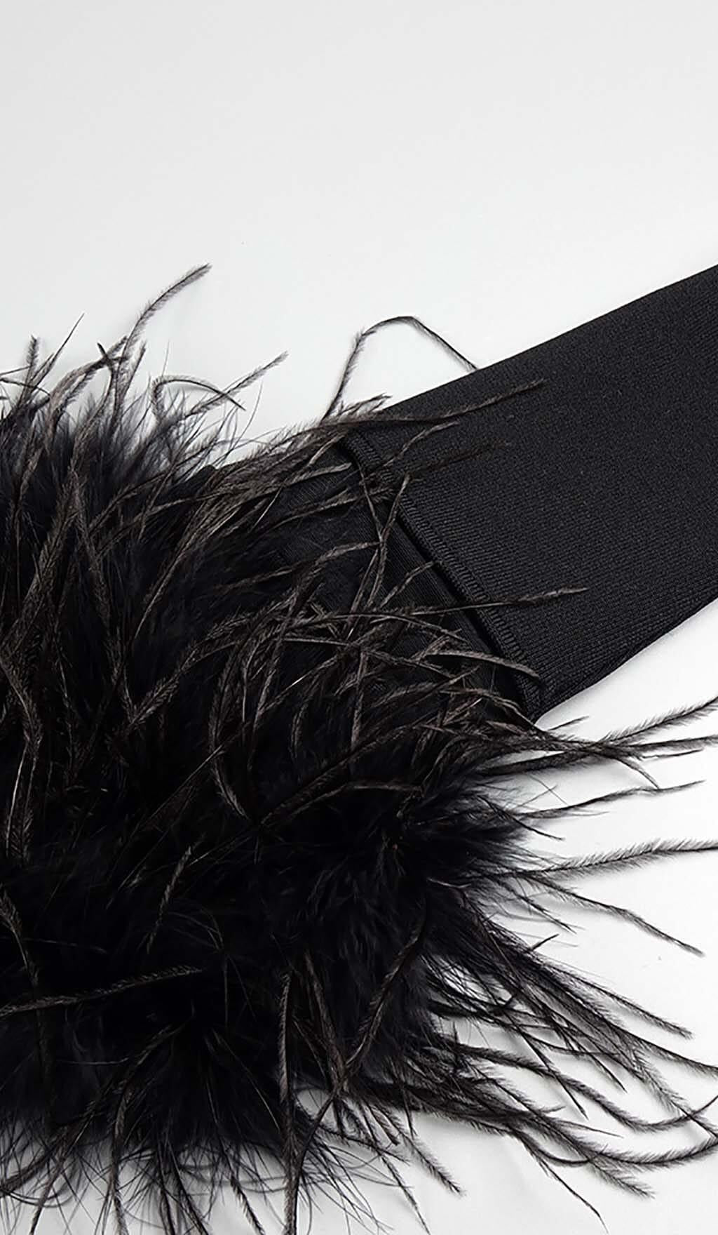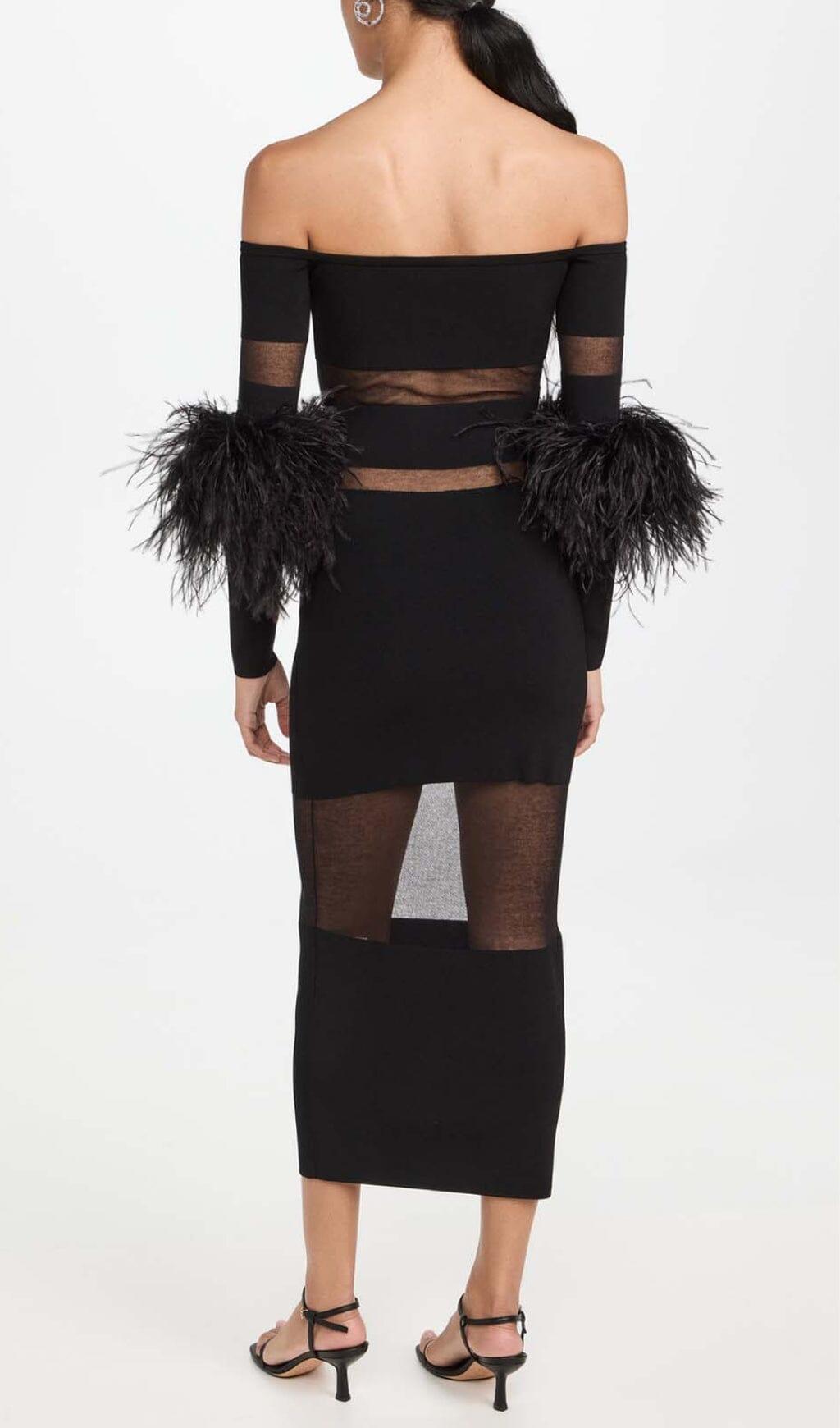 FEATHER TRIM COLD-SHOULDER MIDI DRESS IN BLACK